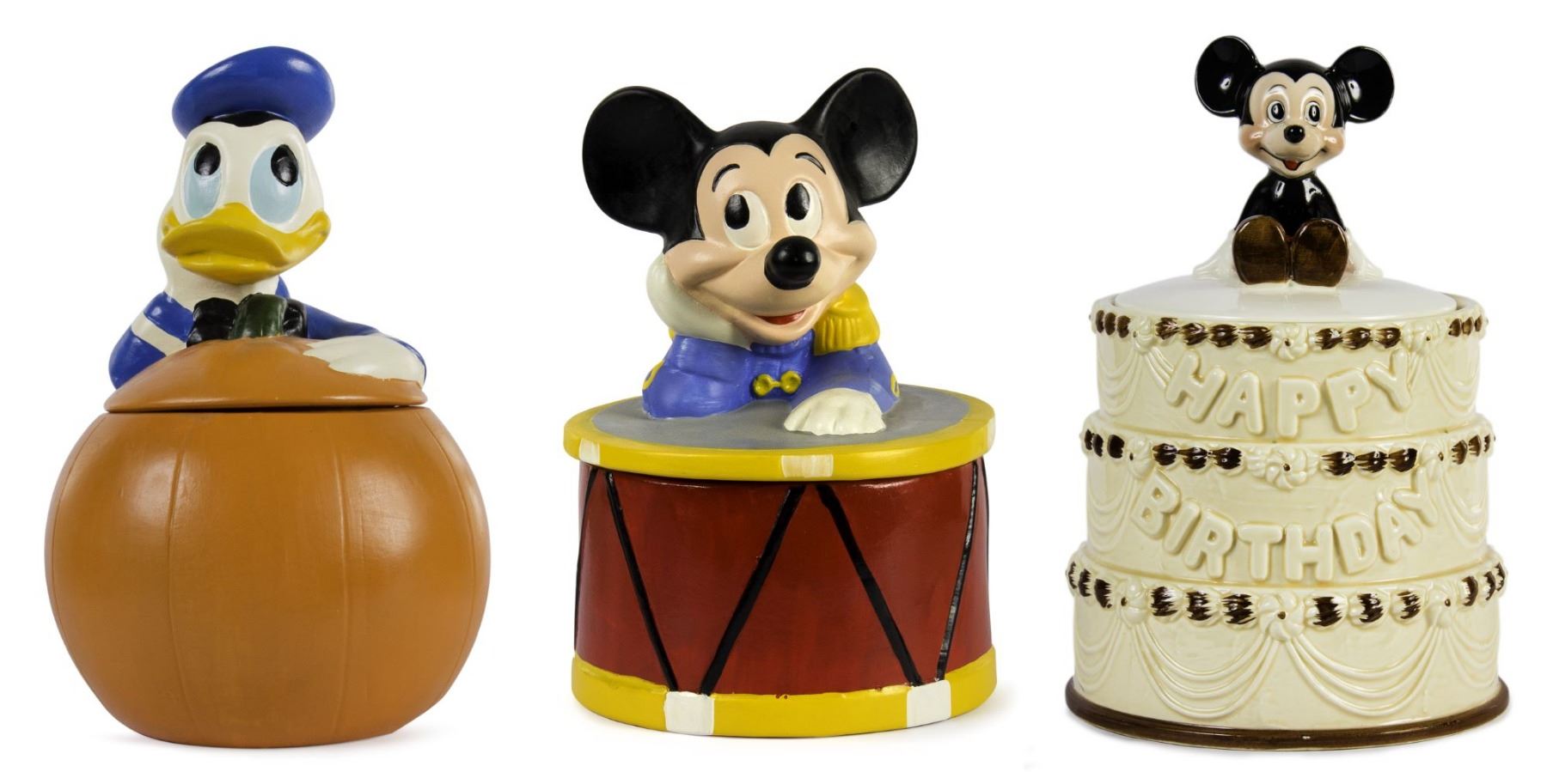 (California Originals, c.1970s) A collection of (3) hand-painted ceramic cookie jars featuring Donald Duck and Mickey Mouse, believed to have been created by California Originals. While later version of these jars would have an engraved "Walt Disney Productions" copyright along the base, these earlier versions do not have an engraved base, but are stamped with ink on the underside of the lids and the bottom of the bases. The cookie jars measure 11" tall and are in very good condition with minor wear from display.