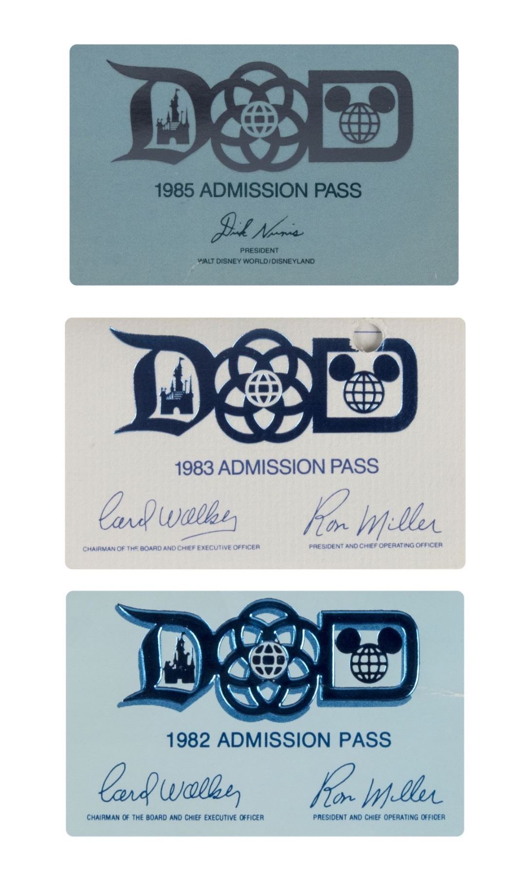 (Disneyland, 1982-85) A collection of (3) Disney Parks admission passes given to employees of Walt Disney Productions. These passes are each marked with the year they were valid, and allowed the employee and their guests free parking and admission to either Disneyland, Walt Disney World, or EPCOT Center. These passes are for the years 1982, 1983, and 1985. The 1983 pass is stamped "Specimen" inside and has a hole-punch in the top-right corner. The passes measure 2.25"x3.5" and are in good condition with some surface wear from use.