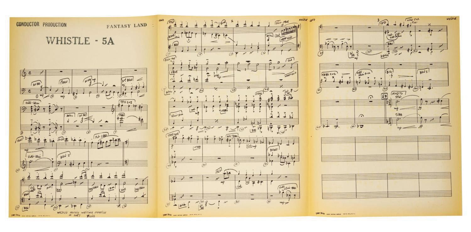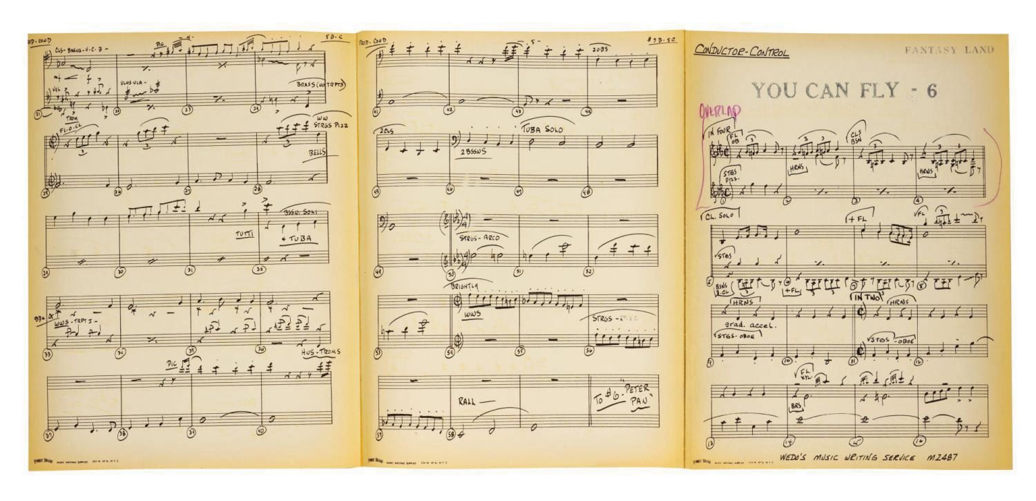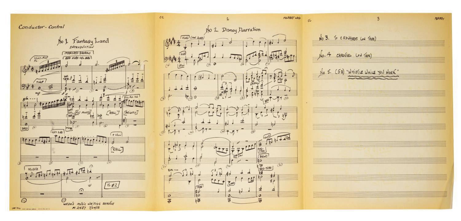 (Disneyland, 1956) A collection of (3) printed orchestral music segments used in the recording session of the Fantasyland portion of the "Walt Disney Takes You to Disneyland" record album. Most of the "Fantasyland" orchestration (arranged by conductor Tutti Camarate) is included. Highlights include "When You Wish Upon a Star" introduction to "Walt's narration" segment, the Carousel, the Cliff Edwards segment, "Whistle While You Work," "Some Day My Prince Will Come," "Heigh-Ho," and "You Can Fly." Measuring 12.75"x9.5" when closed, the music sheets display in very good condition, exhibiting mild toning from age.