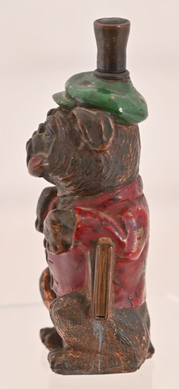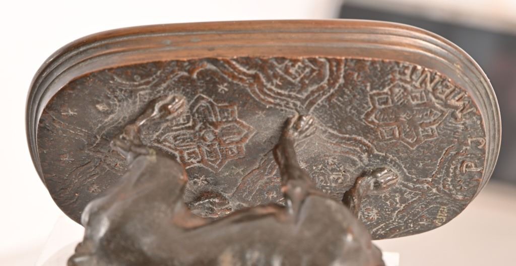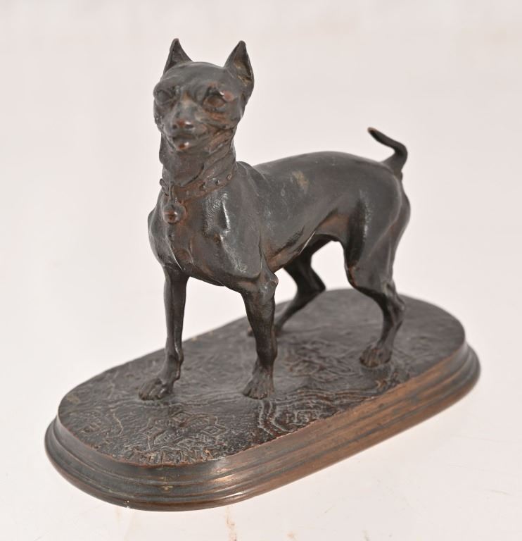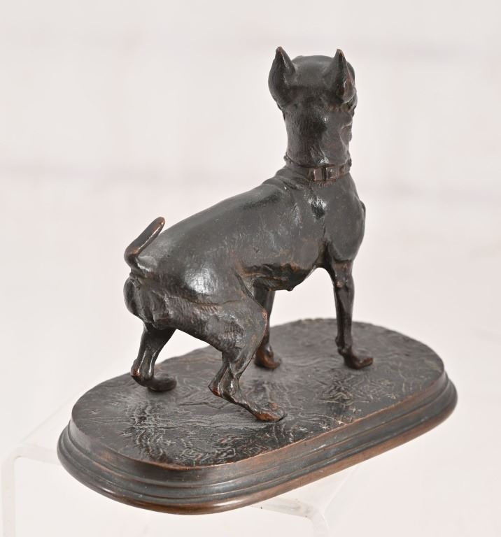 Ronson bull dog bronze lighter circa early 1900's, 2" x 5", marked Ronson underneath along with patent date. Miniature Pinscher bronze artist marked "P.J. Mene" Pierre Jules Mene (French 1810-1877), measures 3" x 5" x 5.5"