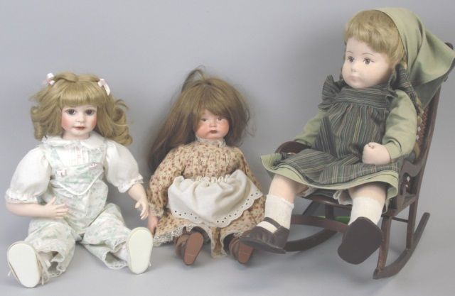 "Jennifer" Hamilton collection 1990 and cloth doll in a cane seated doll rocking chair.