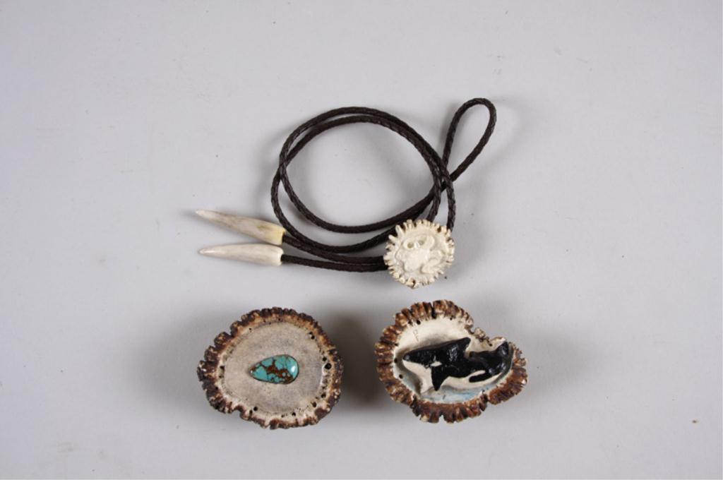 Collection of 3 Folk Art Pieces Consisting of a bolo tie with big horn sheep design, and two belt buckles. One buckle has a turquoise cab and the other has a whale design.Consisting of a bolo tie with big horn sheep design, and two belt buckles. One buckle has a turquoise cab and the other has a whale design.