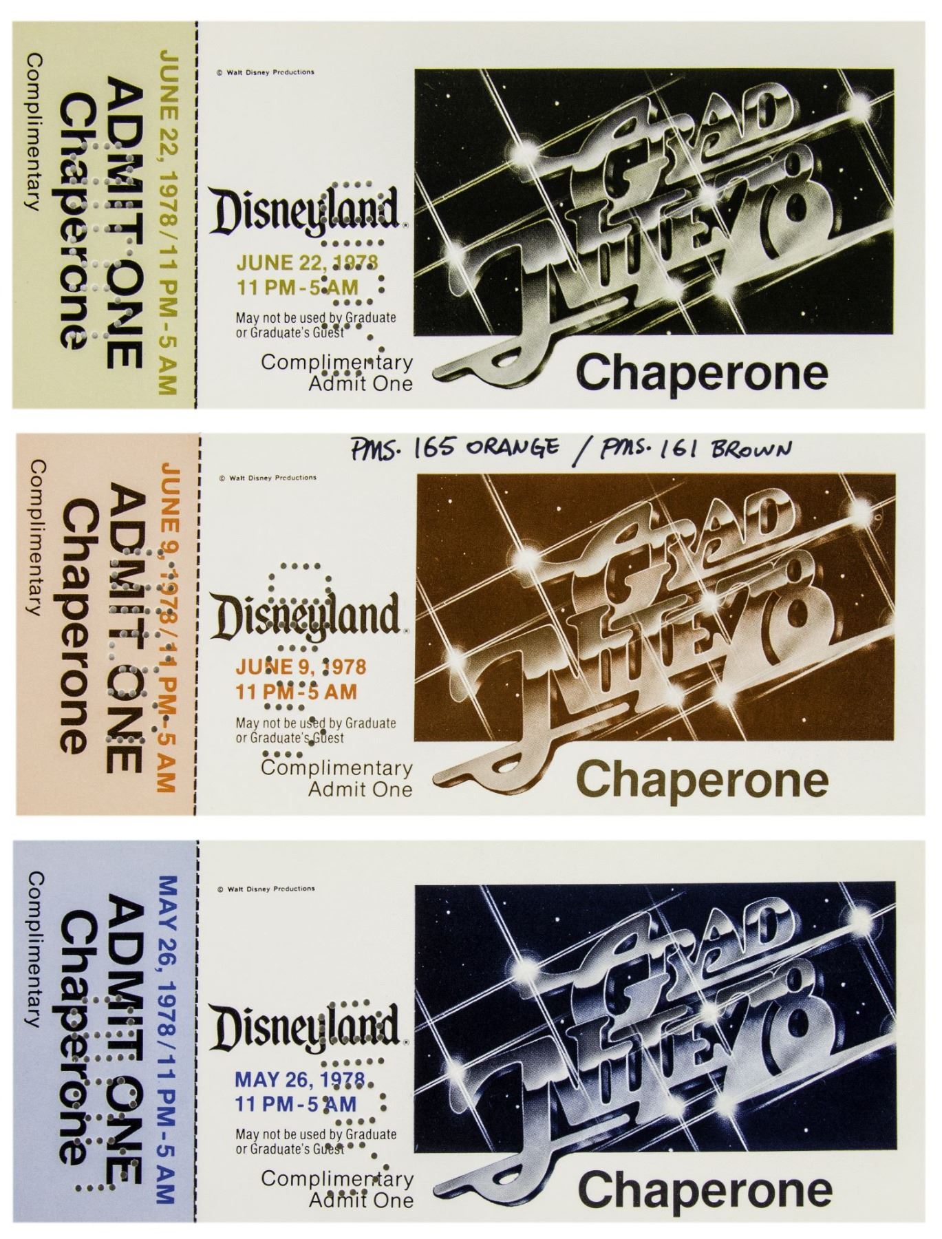 (Disneyland, 1978) A set of (3) extremely rare complimentary Chaperone tickets from Disneyland's "Grad Nite '78" events. The tickets are for different days and feature different colors. The tickets are all complete with admission stubs still intact. Each ticket measures 2.5"x6" and the set is in very good condition with minor wear. The word "void" is punched into the tickets and the brown ticket has some writing along the top-edge.