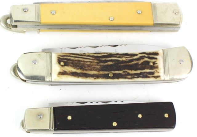 the largest Harley Davidson 7 3/4" open with stag grips, plus a yellow Micarta grips 7 1/2" and the last with ebony grips 6 1/2" with buffed blade. Est. 250-450