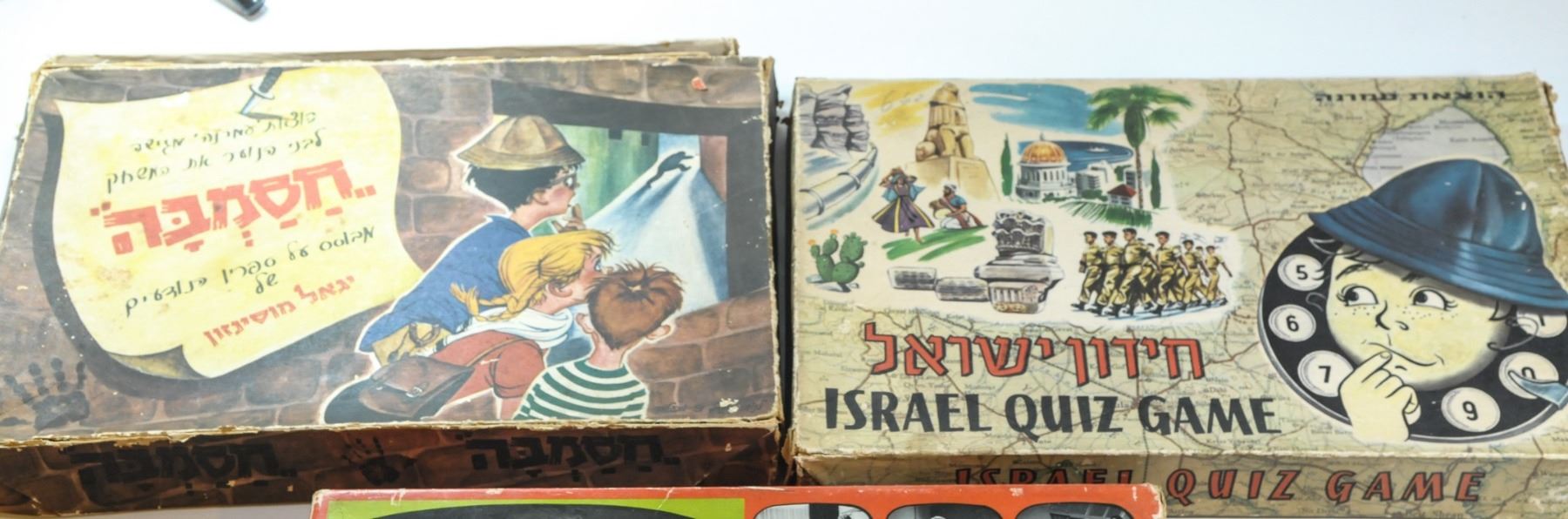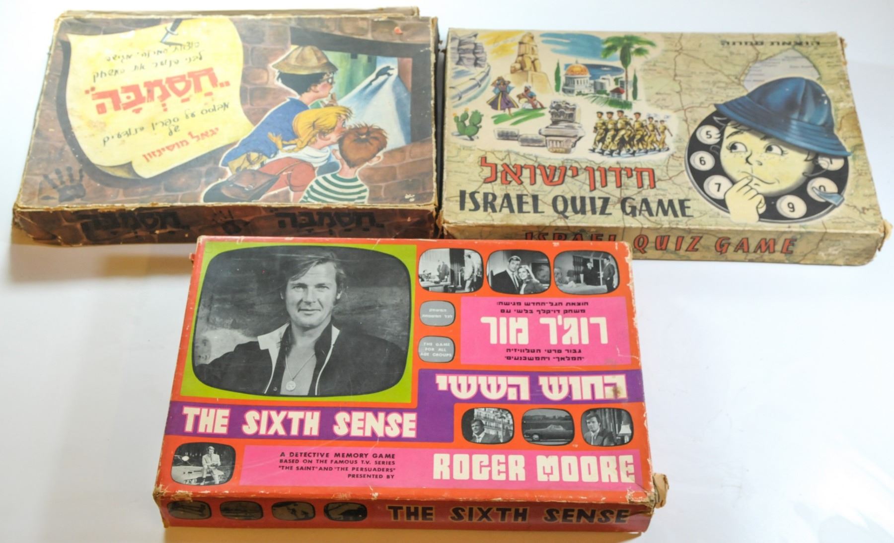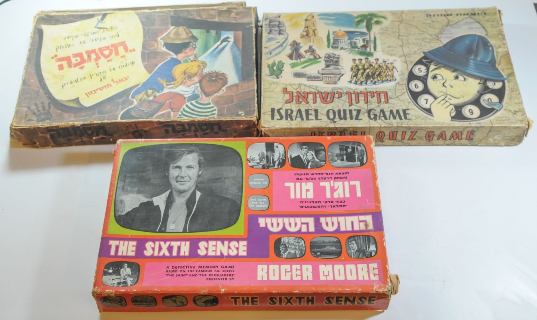 Collection of 3 Israeli board games: 1. Hasamba, issued by Amarna, includes board, vessels and instructions, box worn and torn 2. The Sixth Sense, double-card detective game with Roger Moore, issued by Hagal Hachadash, complete (board and plates), box somewhat worn and torn. 3. Israeli Trivia, issued by Amarna, complete, comes with board, vessels and instructions, worn box, some tears on edges.