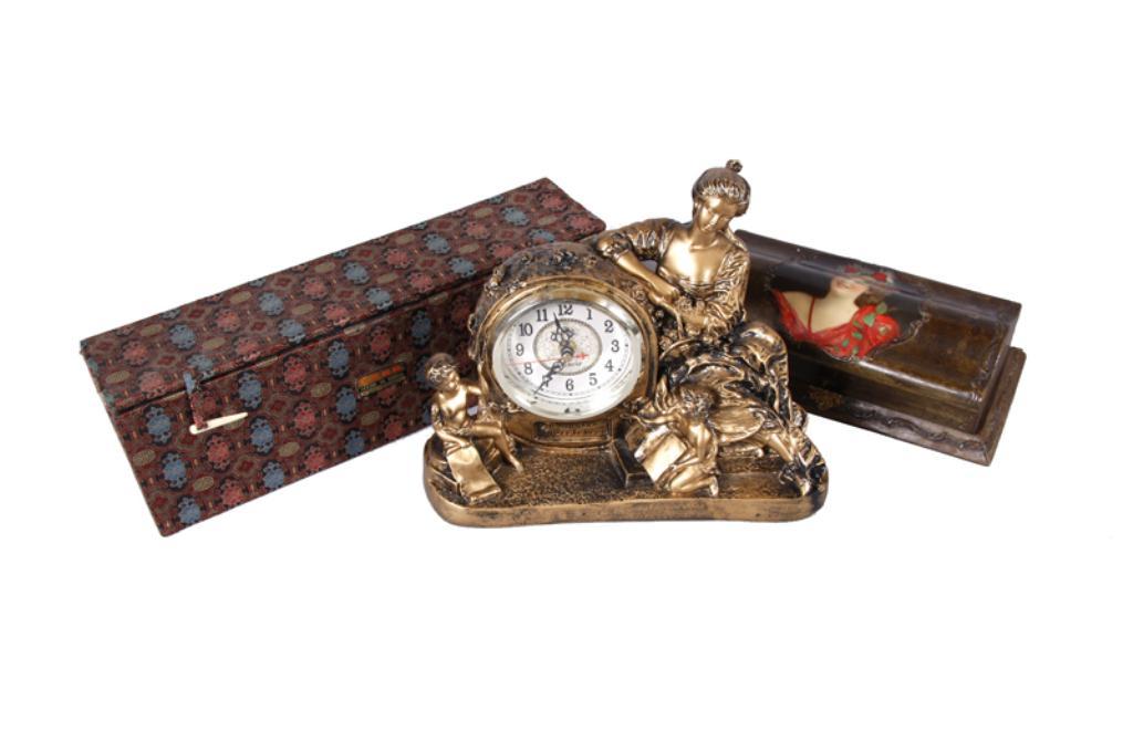 Collection of 3 Items Including a reproduction Victorian mantle clock by Prosa,a floral design box, and a wooden jewelry box with lady decoration.Including a reproduction Victorian mantle clock by Prosa,a floral design box, and a wooden jewelry box with lady decoration.