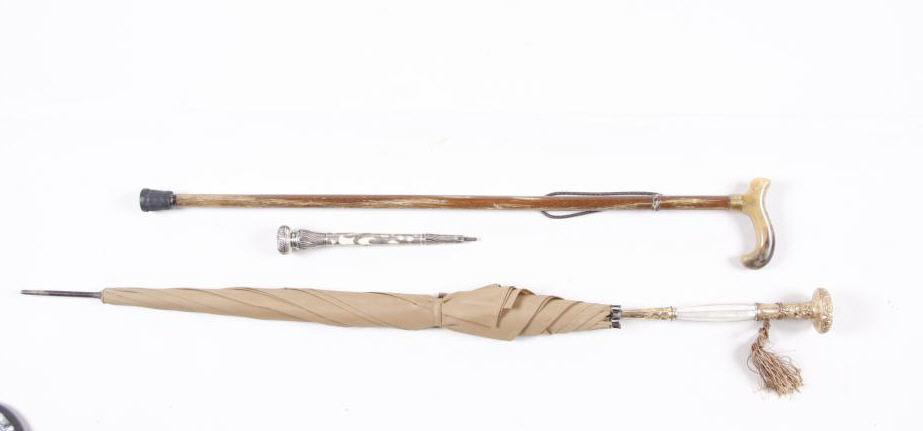 Collection of 3 Items Including an antique umbrella with Mother of Pearl handle, a sterling and bone umbrella handle, and a cane.Including an antique umbrella with Mother of Pearl handle, a sterling and bone umbrella handle, and a cane.