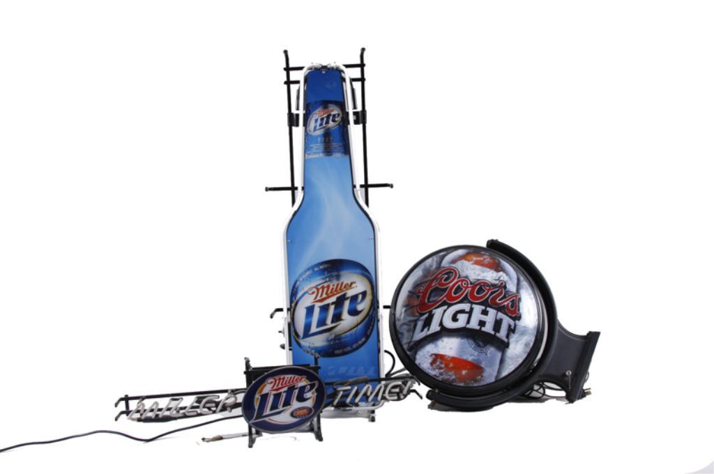 Collection of 3 Lighted Beer Signs One Coors Light & one Miller Lite, both in non-working condition, and one small Miller Lite does work.One Coors Light & one Miller Lite, both in non-working condition, and one small Miller Lite does work.