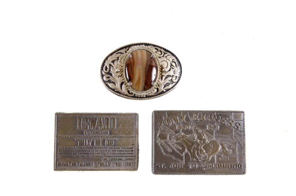 Collection of 3 Metal Belt Buckles 1- Pony Express buckle, 1- Billy the Kid, and 1 with a large brown polished stone.1- Pony Express buckle, 1- Billy the Kid, and 1 with a large brown polished stone.