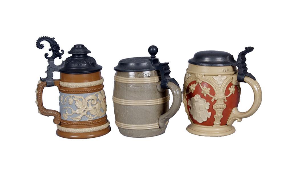 Collection of 3 Mettlach Steins #2077", "675", and #1740", all have pewter lids, all stamped on bottom, in overall excellent condition.#2077", "675", and #1740", all have pewter lids, all stamped on bottom, in overall excellent condition.