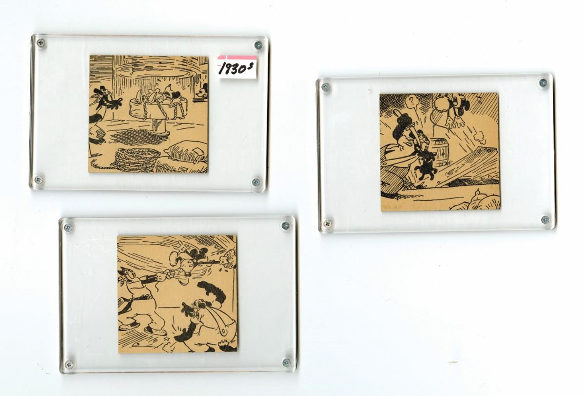 (AMOCO, 1933) "Penny Cards" were hand-made by cutting out panels from already manufactured Mickey Mouse artwork, and adhering them to a custom cardboard backing with the name of the company that sold the cards and their card number within the set. These three 3"x3" cards are individually displayed within 4"x6" clear protective cases. Penny Cards are in very good condition.