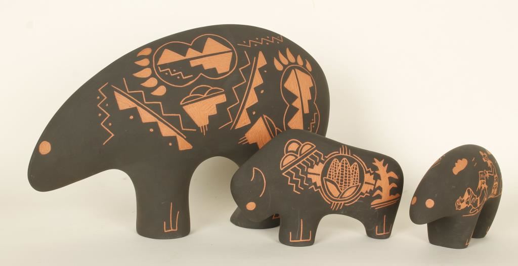 Incised carved depicting 2 bears and 1 buffalo. Signed 'AB'. Various sizes