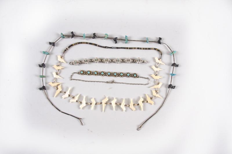 Collection of 3 Necklaces 2 Native American necklaces: 1 is a fettish with bone & bird effigy's; 1 is silver beads and turquoise nuggets, and the last 1 is a Mexican silver necklace with matching bracelet.2 Native American necklaces: 1 is a fettish with bone & bird effigy's; 1 is silver beads and turquoise nuggets, and the last 1 is a Mexican silver necklace with matching bracelet.