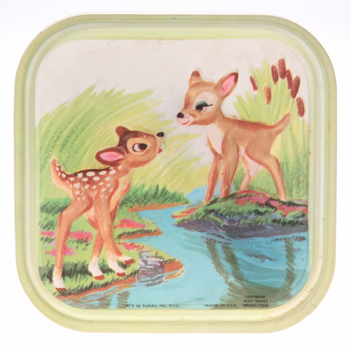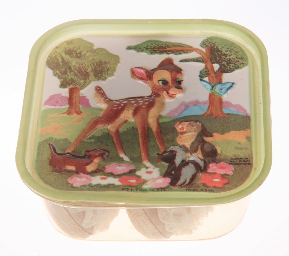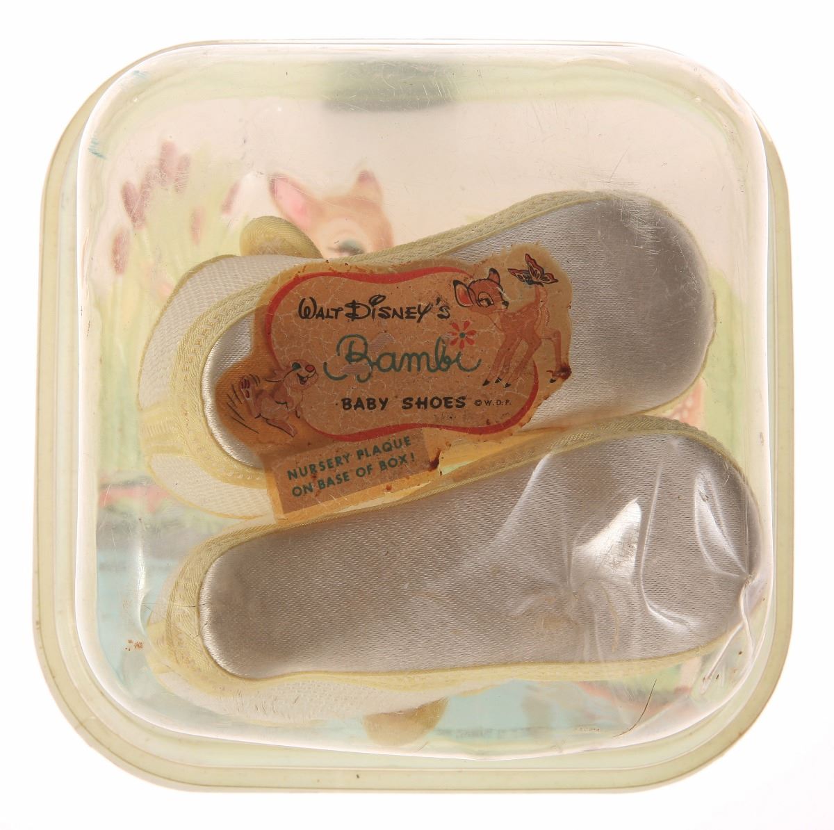 (Disneyland, 1950s) Collection of (3) pairs of Bambi baby shoes created by Plaxall Inc. Shoes come in a colorful decorative container featuring artwork from Walt Disney's "Bambi". The lids of the containers are advertised as a nursery plaque to hang on the baby's wall. Pairs come with their original containers, shoes, and two have their gift cards. Containers measure 5"x5"x2.5". Set is in good condition with some wear.