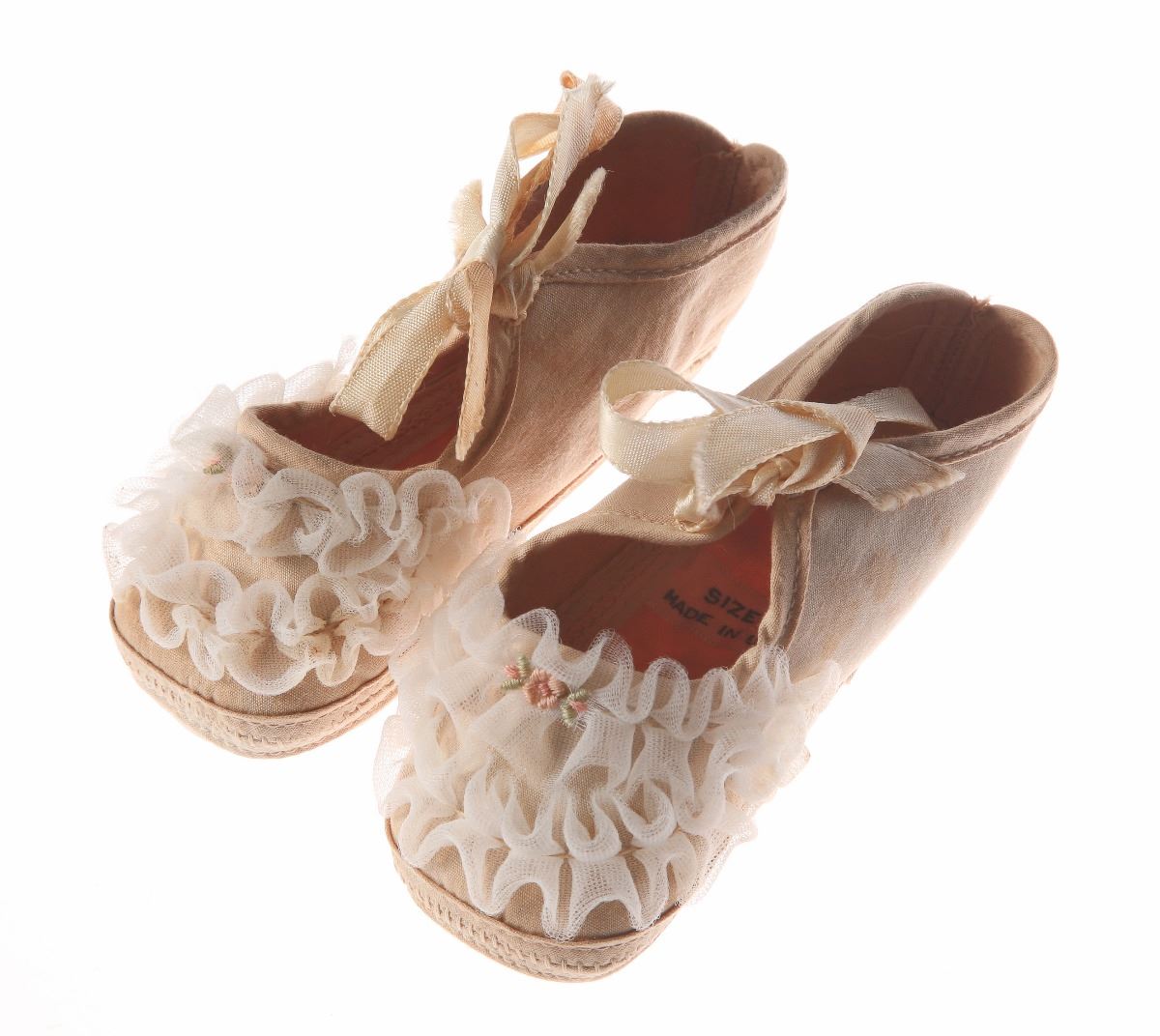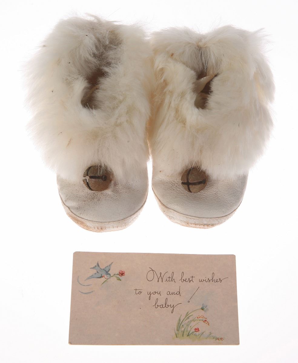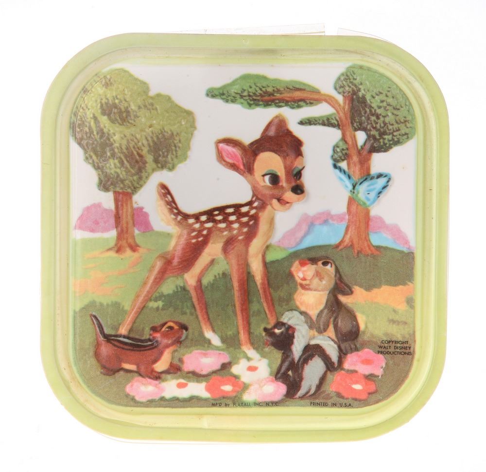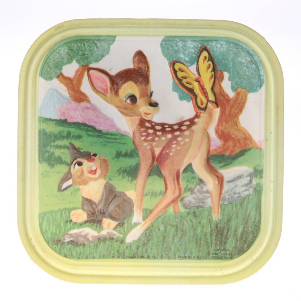 (Disneyland, 1950s) Collection of (3) pairs of Bambi baby shoes created by Plaxall Inc. Shoes come in a colorful decorative container featuring artwork from Walt Disney's "Bambi". The lids of the containers are advertised as a nursery plaque to hang on the baby's wall. Pairs come with their original containers, shoes, and two have their gift cards. Containers measure 5"x5"x2.5". Set is in good condition with some wear.