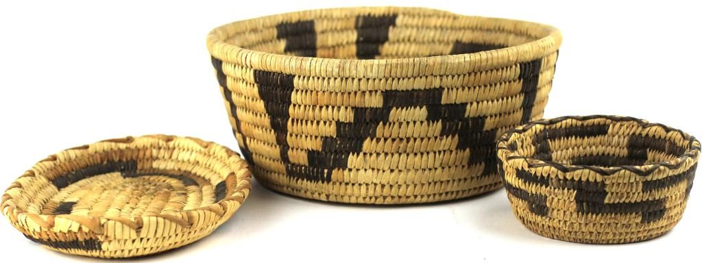 Collection of 3 Papago baskets, the largest 3 1/2" X 8 1/2" showing very good condition, one 2" X 4" very good and the tray 7" X 5" showing good condition. Est. 150-250