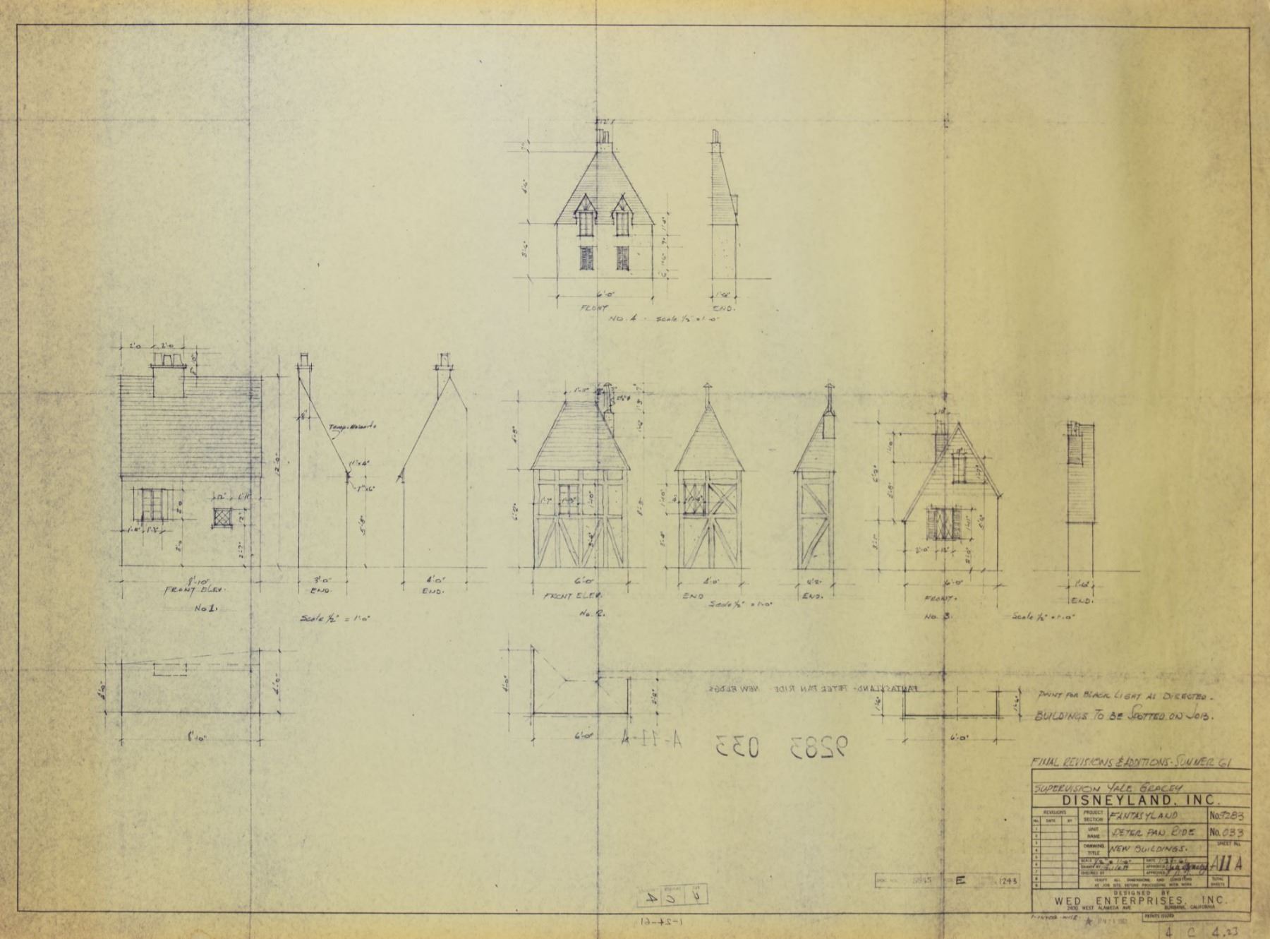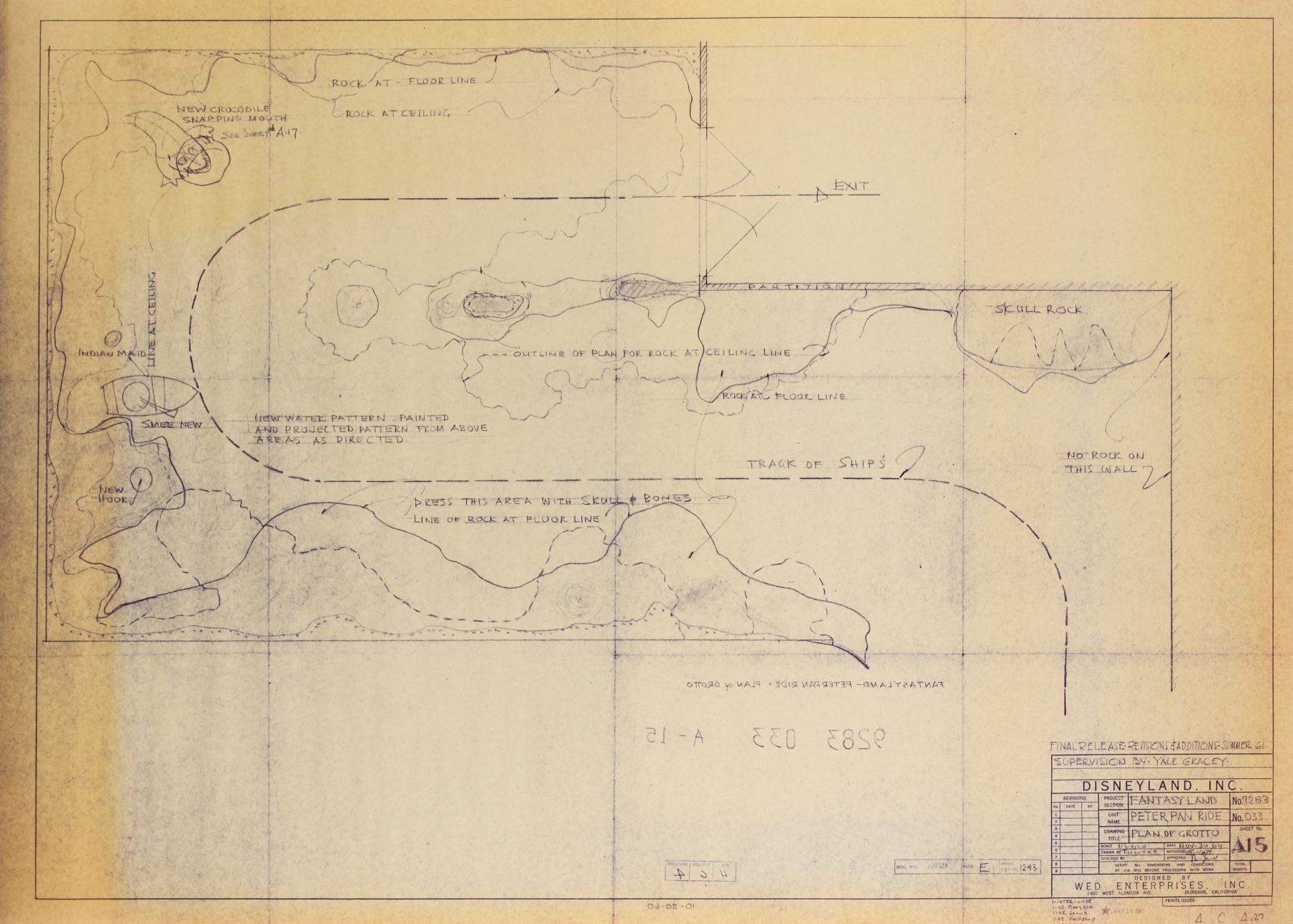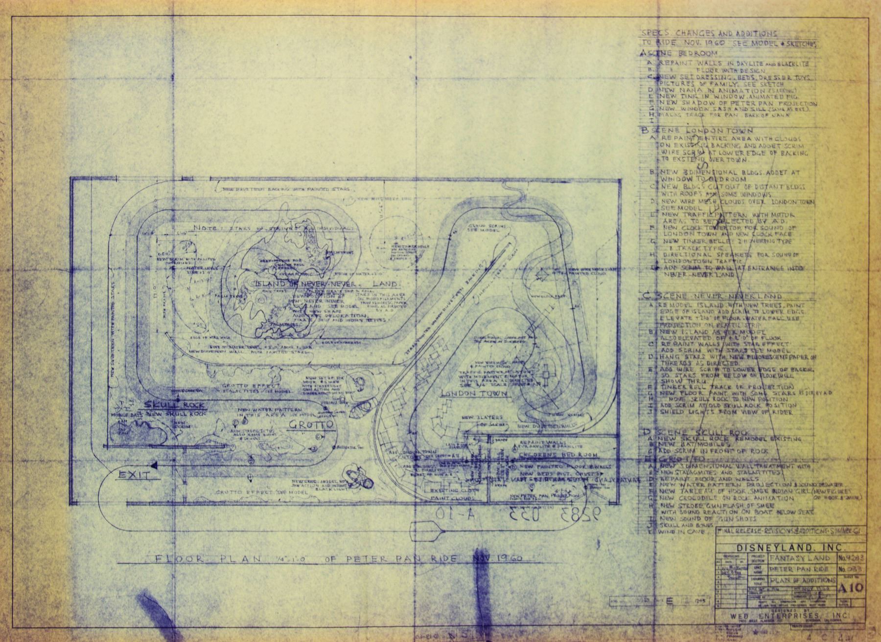 (Disneyland, c.1961) A collection of (3) brownlines created for Disneyland's "Peter Pan's Flight". These brownlines were created for a refurbishment to the attraction in the early 1960s, and lists aspects such as where the "New Hook", "New Crocodile Snapping Mouth", and "New Water Pattern" are going to go. The brownlines feature incredible views of the attraction and depict a floor plan for the attraction, a floor plan for the Grotto, and several new buildings. The brownlines measure approximately 30"x42" and are in good condition with some wrinkling and wear from use. The brownline depicting the new buildings has some moisture-wear to the top-right corner.