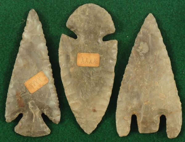 In 5" x 6" riker case. Longest point measures approximately 3 3/4" long. Age / origin unknown. Possible 1950s reproductions.