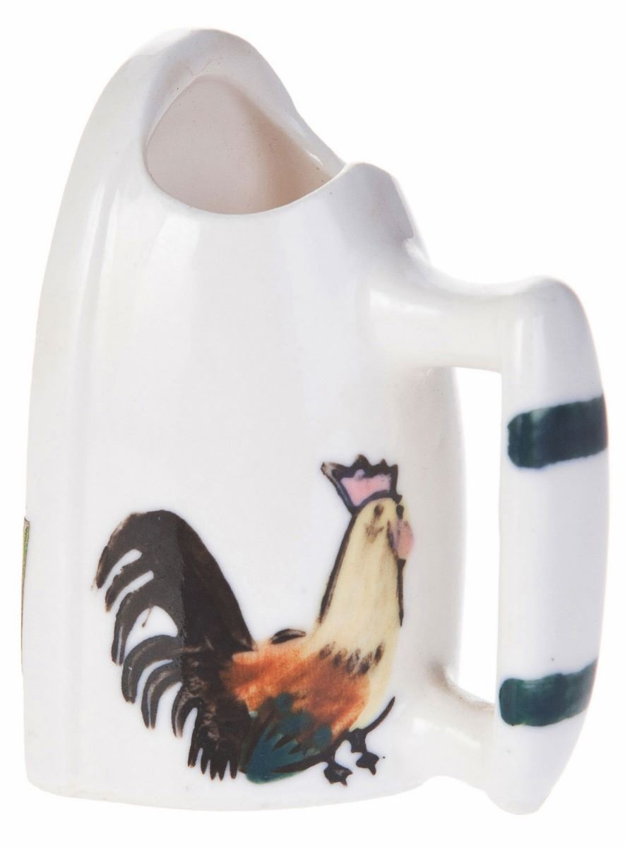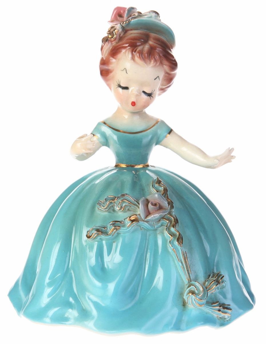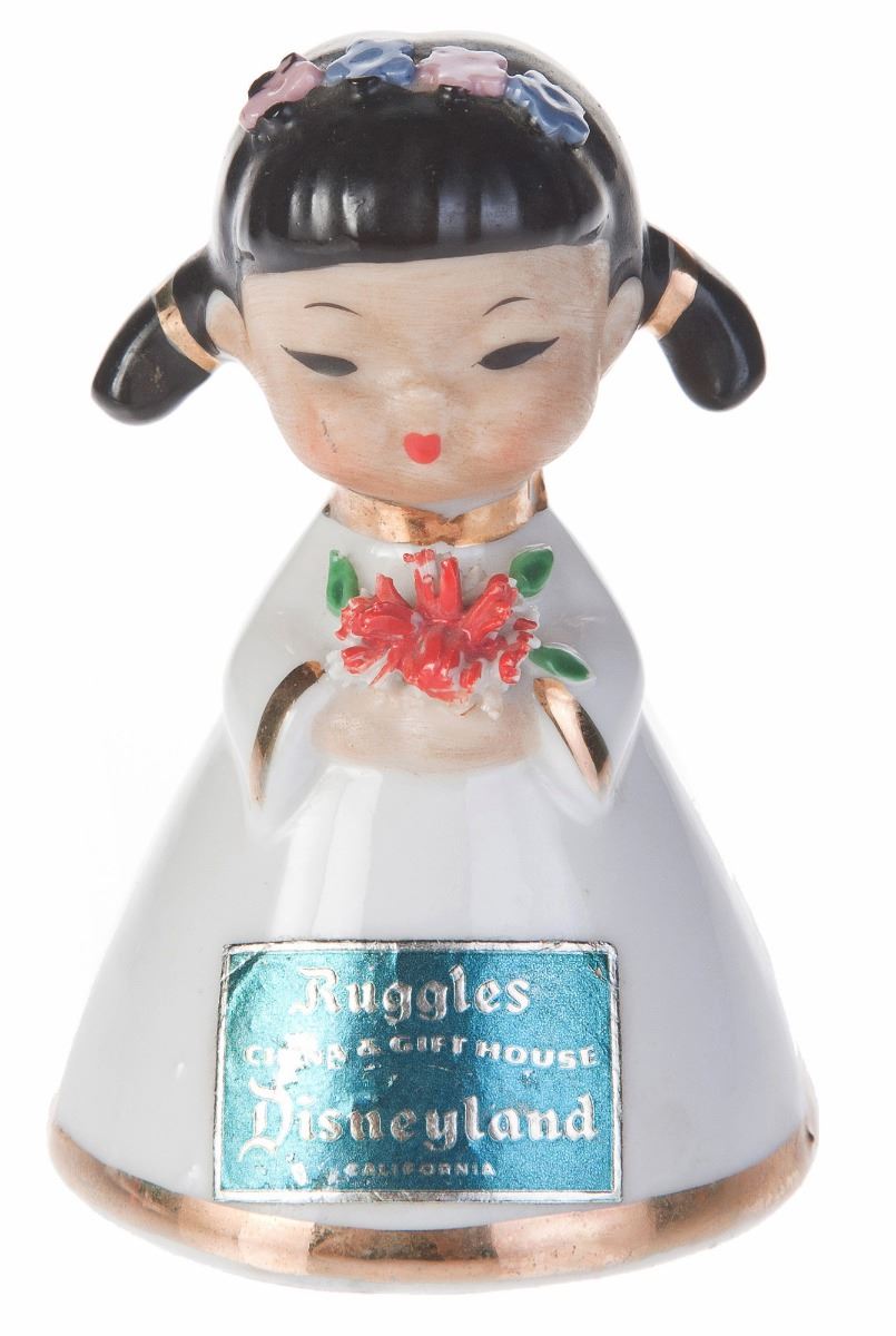 (Disneyland, 1950s) Collection of (3) ceramic souvenirs from the Ruggles China and Gift shop on Main Street. Includes (1) ceramic clothes iron-shaped vase, (1) ceramic woman in a blue dress, and (1) ceramic girl-shaped bell. These items still retain their Ruggles Disneyland labels. This set is in good condition with minor wear.