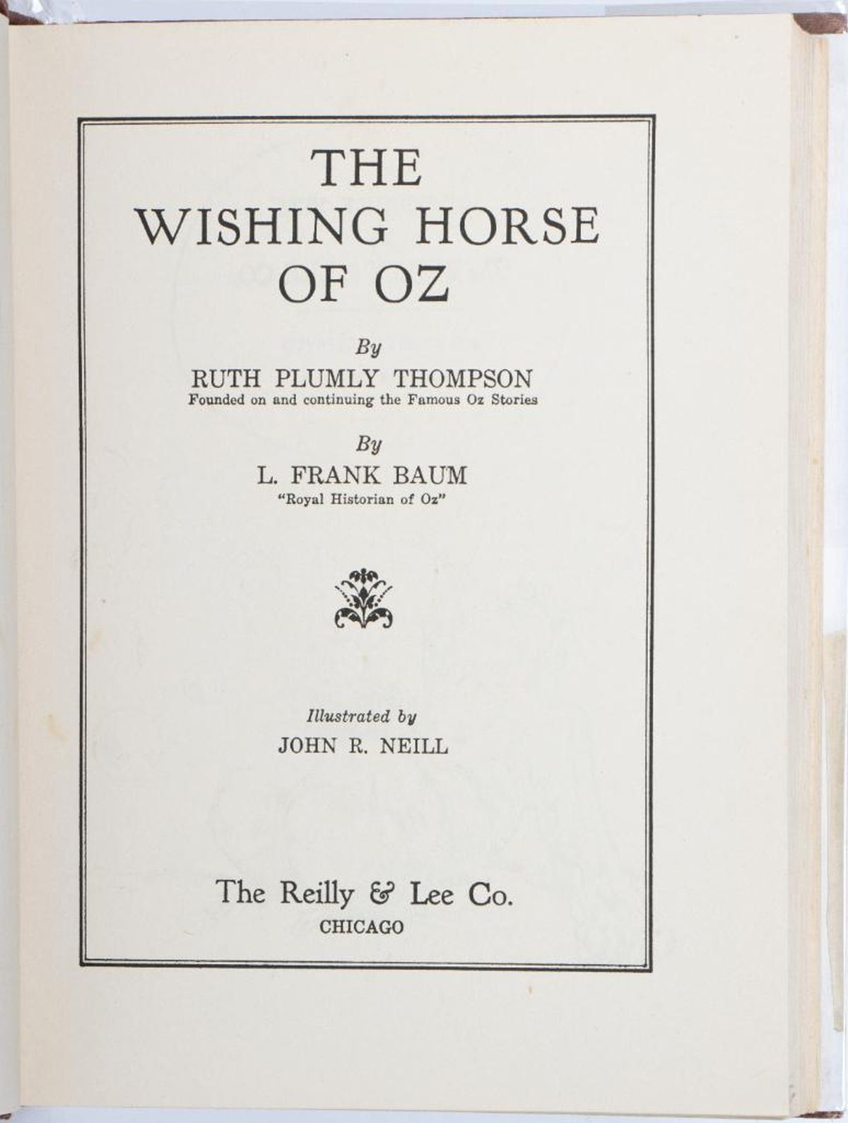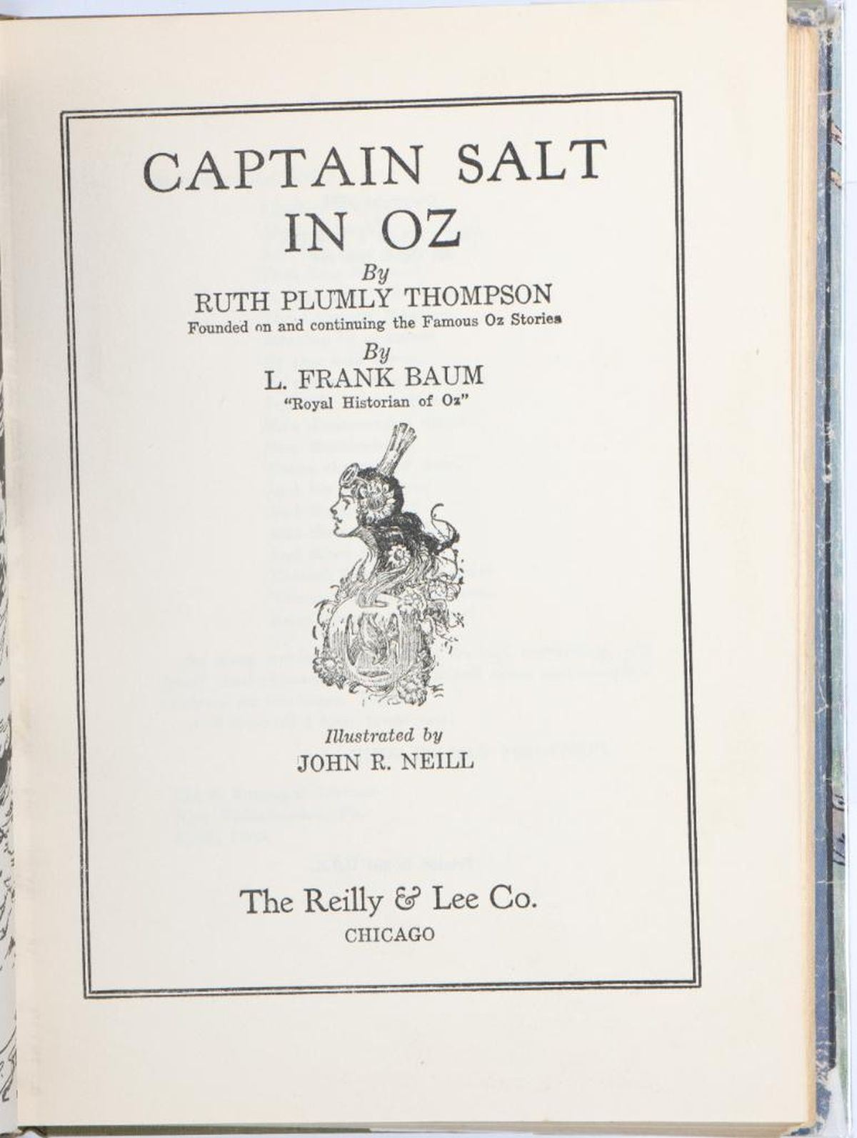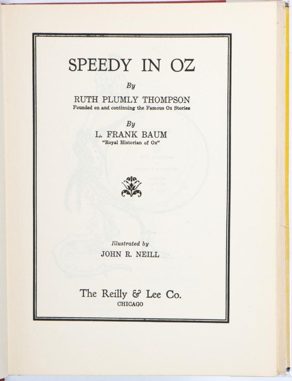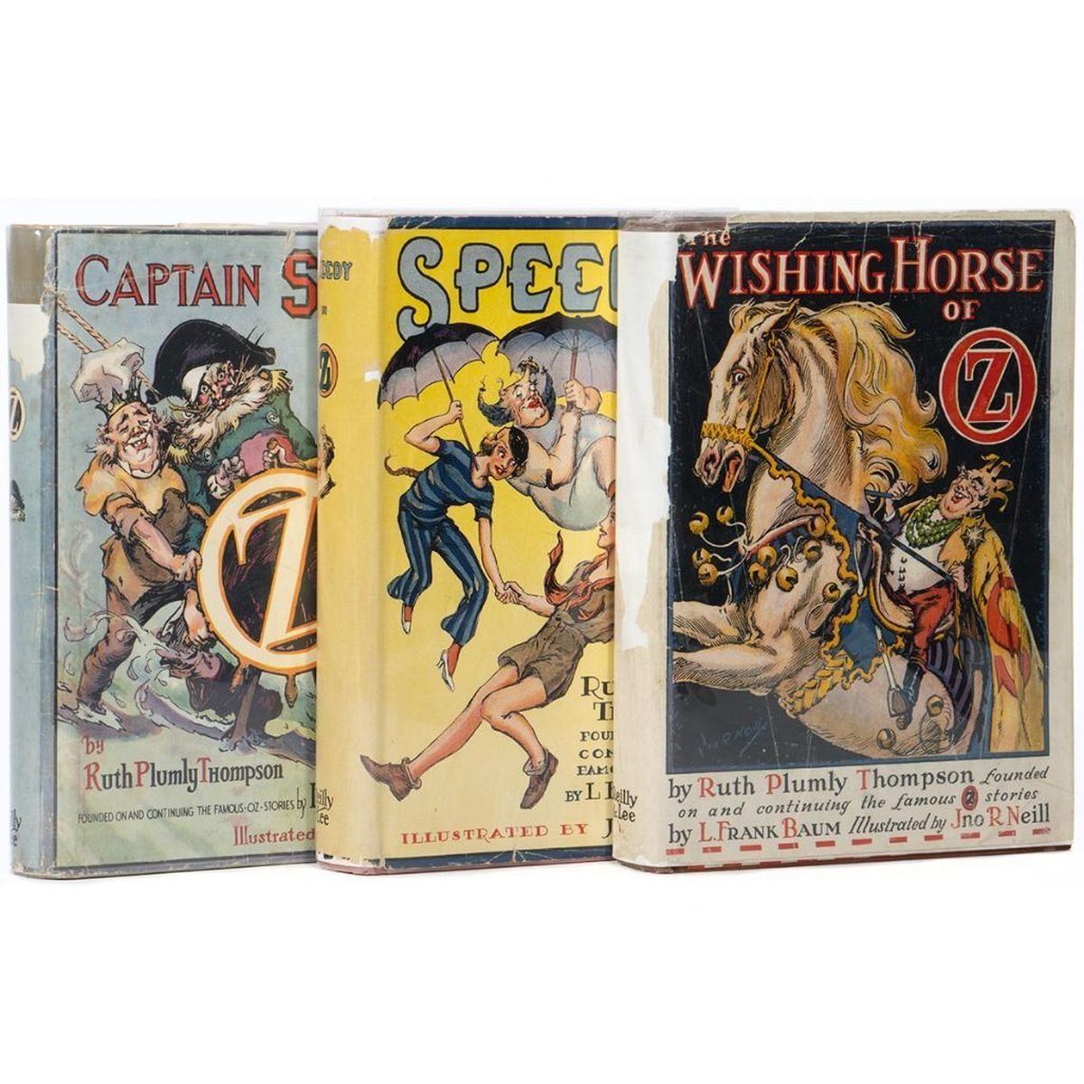 Collection of 3 Ruth Plumly Thompson Oz Books all in dust jackets 16 Speedy in Oz by Ruth Plumly Thompson, illustrated by John R. Neill. Reilly and Lee deep red hardover with pasted cover label, color illustrated dust jacket lists titles through Shaggy Man. Fine, bright copy in very good jacket. The Wishing Horse of Oz by Ruth Plumly Thompson, illustrated by John R. Neill. Reilly and Lee brown hardover with pasted cover label, color illustrated dust jacket lacks back flap. Very good to fine copy, in fair dust jacket. Captain Salt in Oz by Ruth Plumly Thompson, illustrated by John R. Neill. Reilly and Lee gray-green hardover stamped in silver ink, with pasted cover label, color illustrated dust jacket lists titles through Hidden Valley. Very good in good plus jacket. Very good to fine in fair to very good jackets.