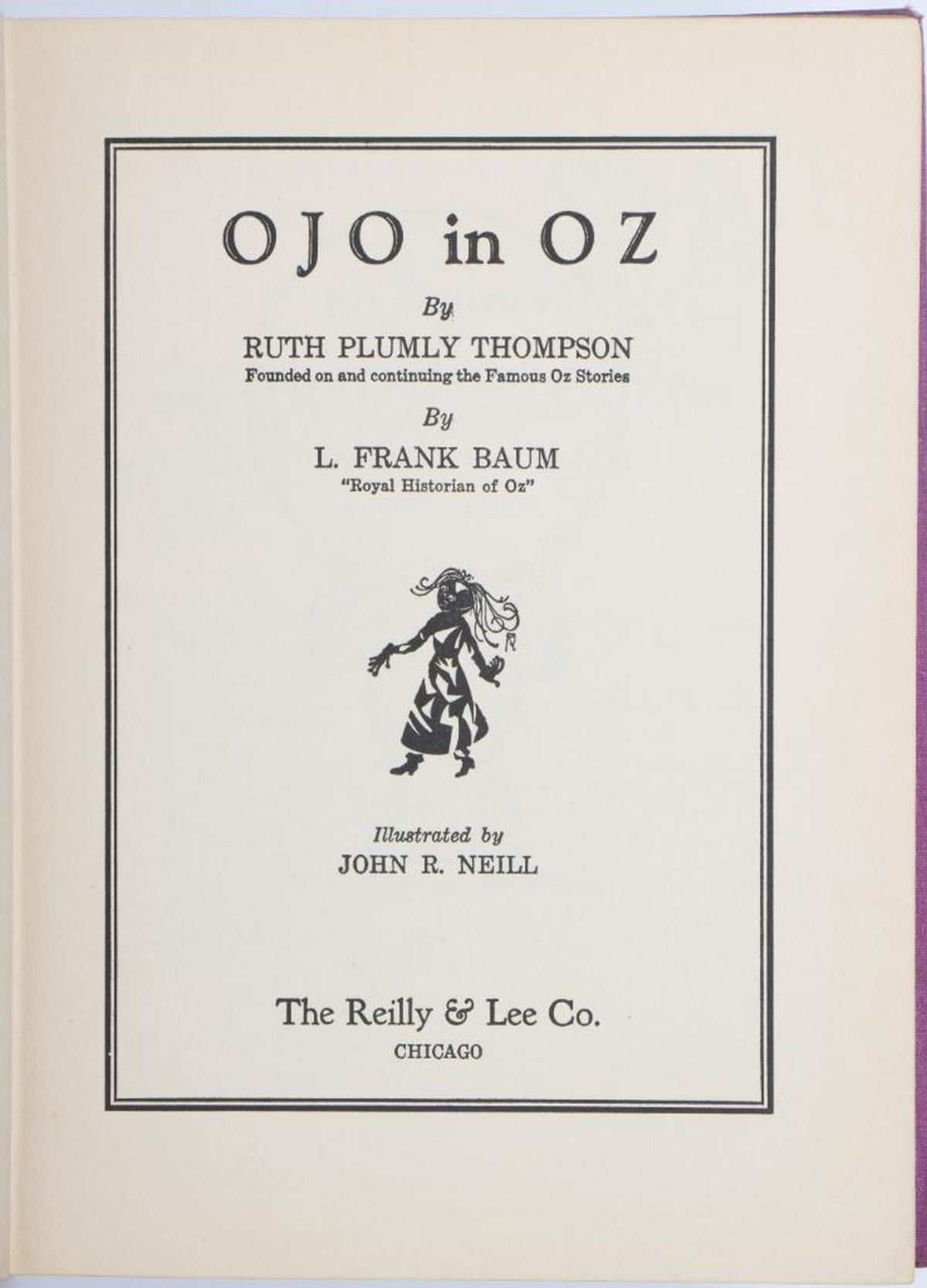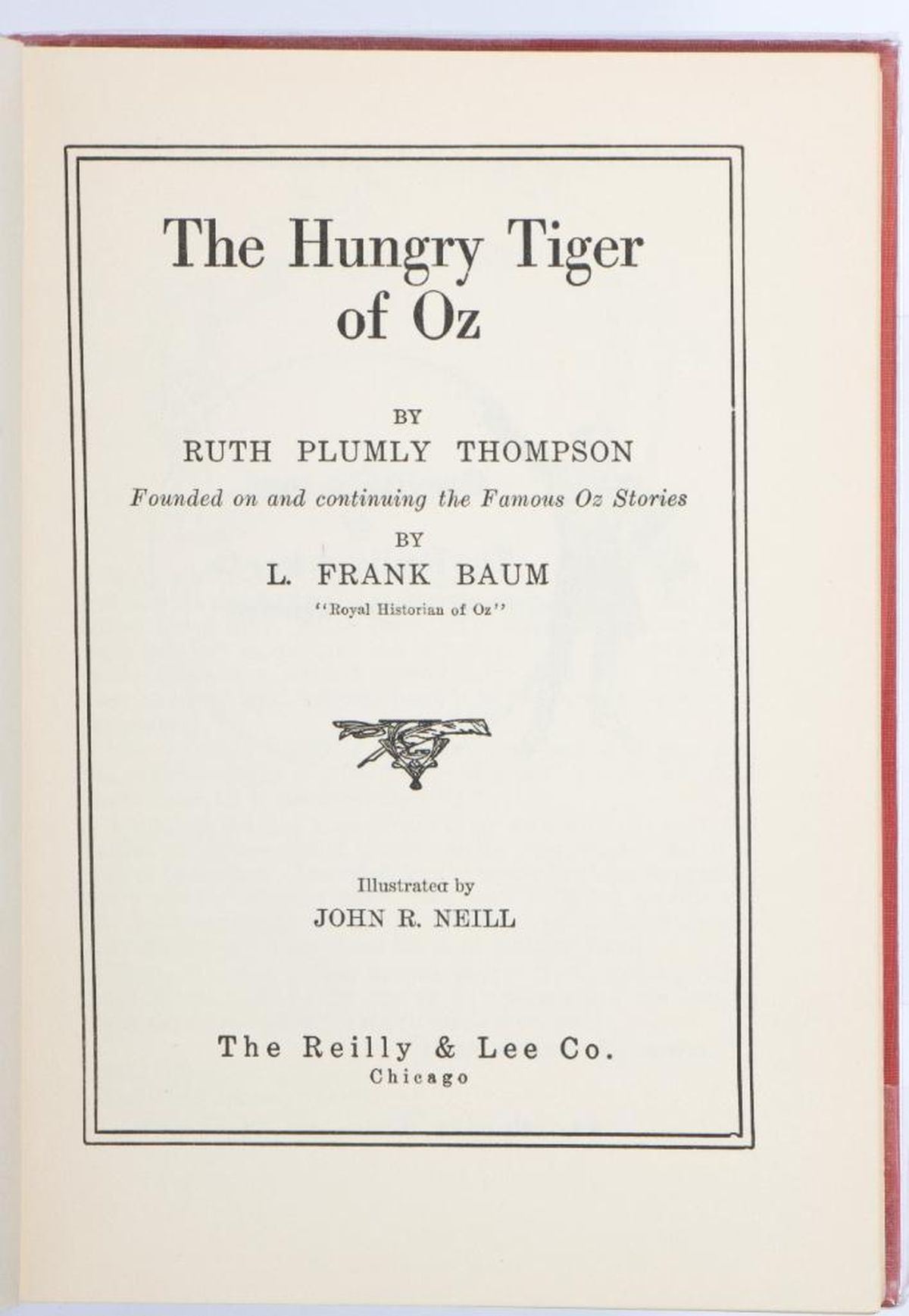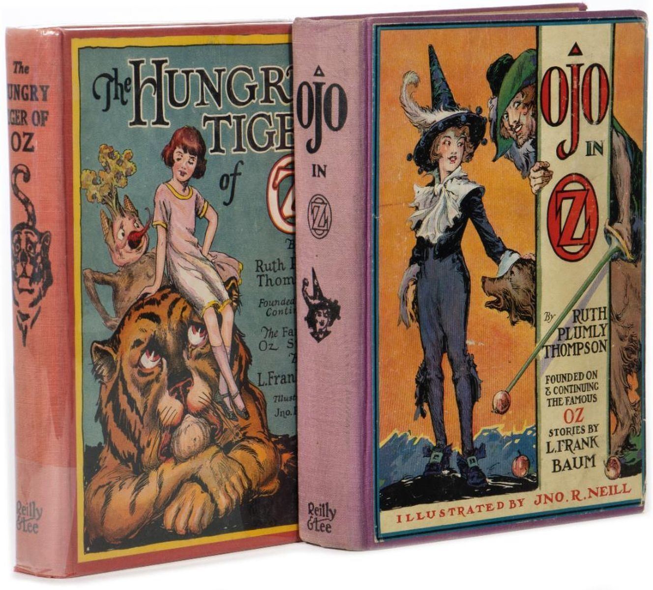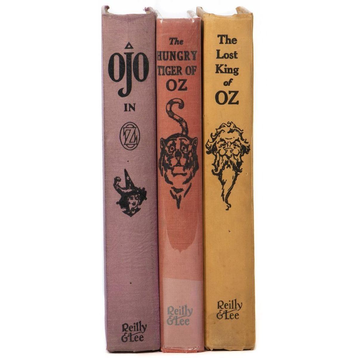 Collection of 3 Ruth Plumly Thompson Oz Books Ojo in Oz by Ruth Plumly Thompson, illustrated by John R. Neill. Reilly and Lee purple hardcover with pasted cover label, good condition. The Hungry Tiger of Oz by Ruth Plumly Thompson, illustrated by John R. Neill. Reilly and Lee red hardcover with pasted cover label, about very good condition, The Lost King of Oz by Ruth Plumly Thompson, illustrated by John R. Neill. Reilly and Lee tan hardcover with pasted cover label, very good condition. Good to very good.