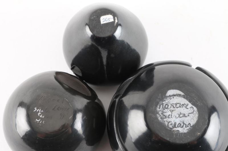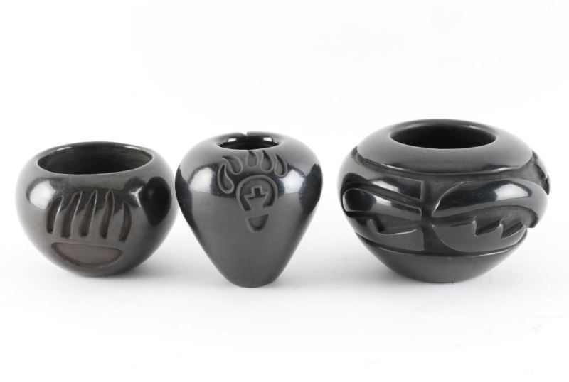 1) inside carved with bear paw design. Done by Roseai Lewis signed on base. Measure 3 inches diameter 2) done by Denise Martinez measure 4 inches diameter. 3) Inside carved pot By Ethel Yazza signed in base. Measures 3 inches..