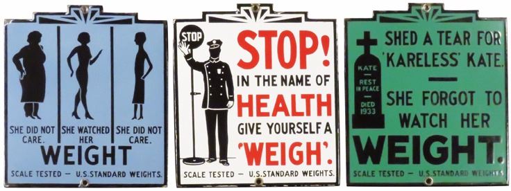 A great Collection of 3 Scale Porcelain Signs. Very minor edge wear and chips otherwise very good condition. 8 1/2 X 9 1/2 inches.