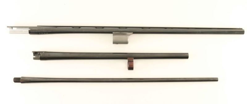 (#1) 410 GA - Blued 26" modified choke barrel for a Winchester 42 with 3" chamber. 55 code in very good overall condition. (#2) 20 GA - Blued 28" modified choke barrel with ventilated sighting rib & 3" chamber for a miscellaneous semi-automatic Beretta shotgun. AM code in overall very good condition. & (#3) 12 GA - Blued cut-down 18 3/4" full choke barrel with 2 3/4" chamber for a Remington 870. CZ code in overall good condition.