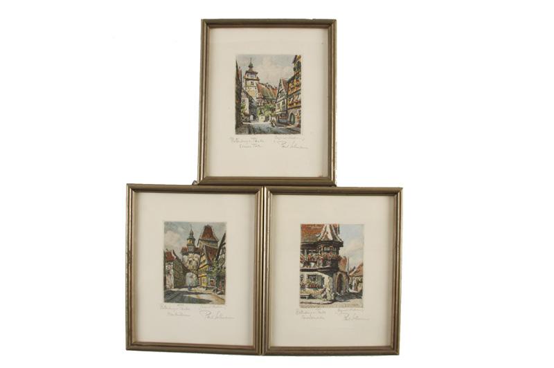 Collection of 3 Small Etchings All are hand colored, signed by Paul Sollmann, image sizes are 4"x5",