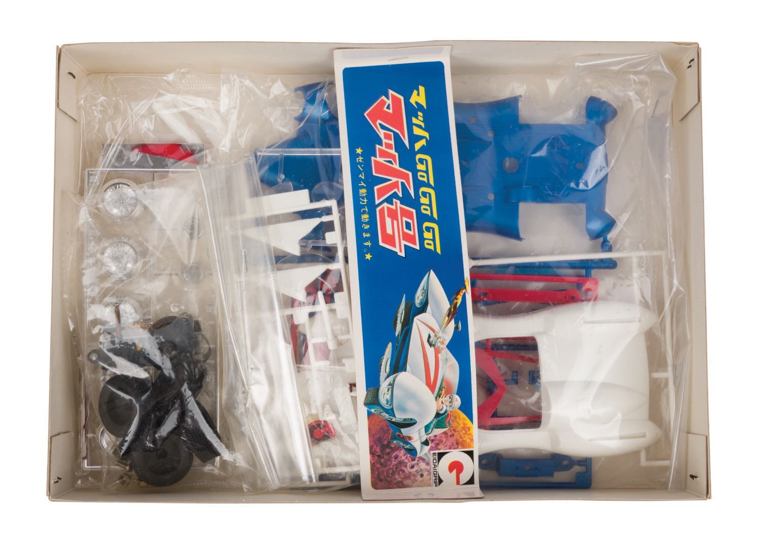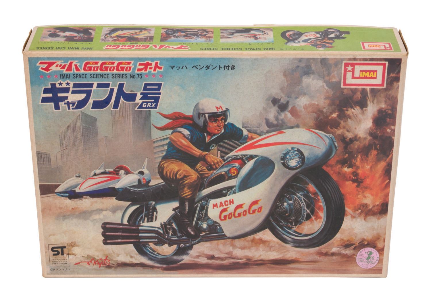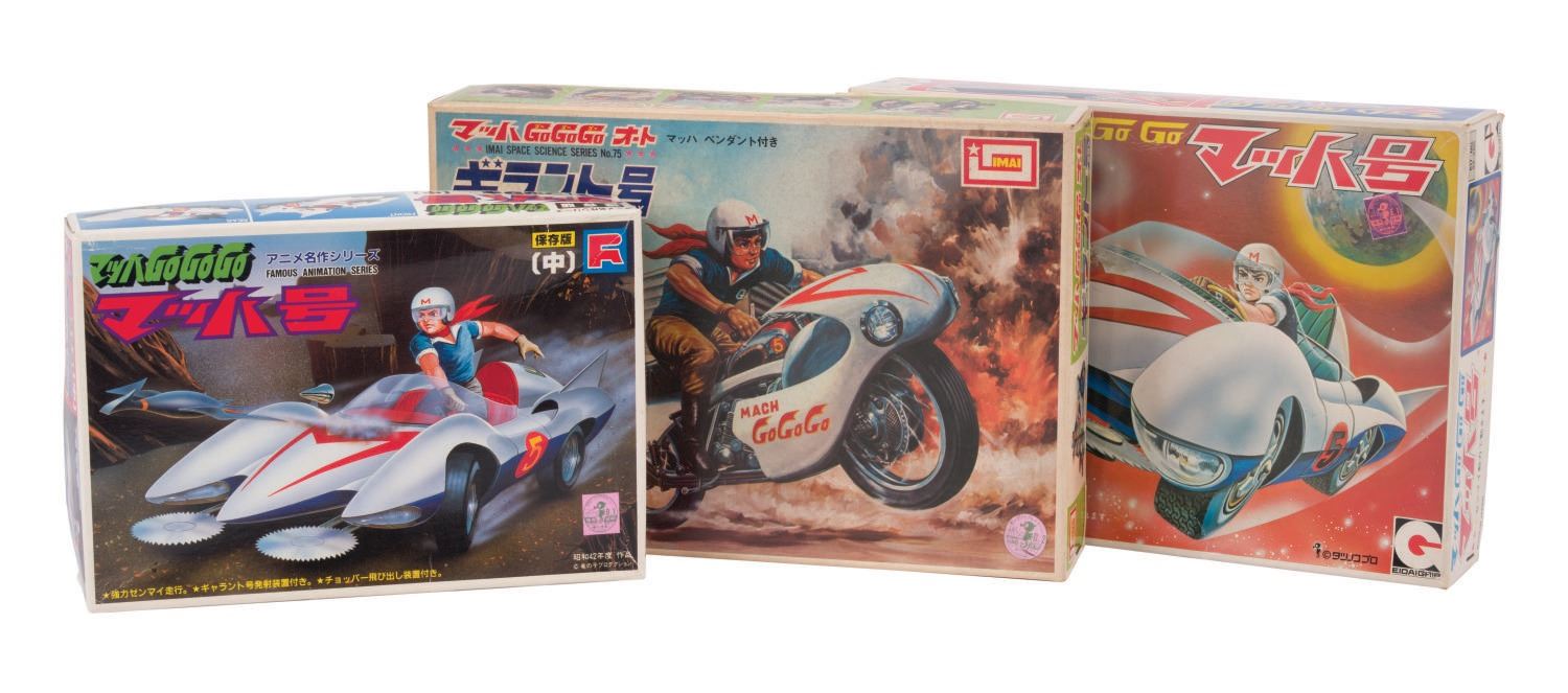 (Fujisaki/Eidai/Imai, 1970s-84) A collection of (3) vintage Speed Racer vehicle model kits. The collection includes both Eidai Grip and Fujisaki Mach V kits and a rare Speed Racer motorcycle kit. All vintage model kits are in fine condition, complete with working mechanized parts, and come with original very-good condition boxes.