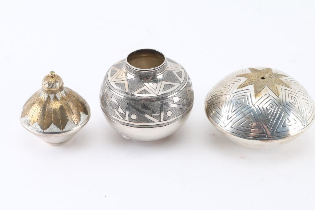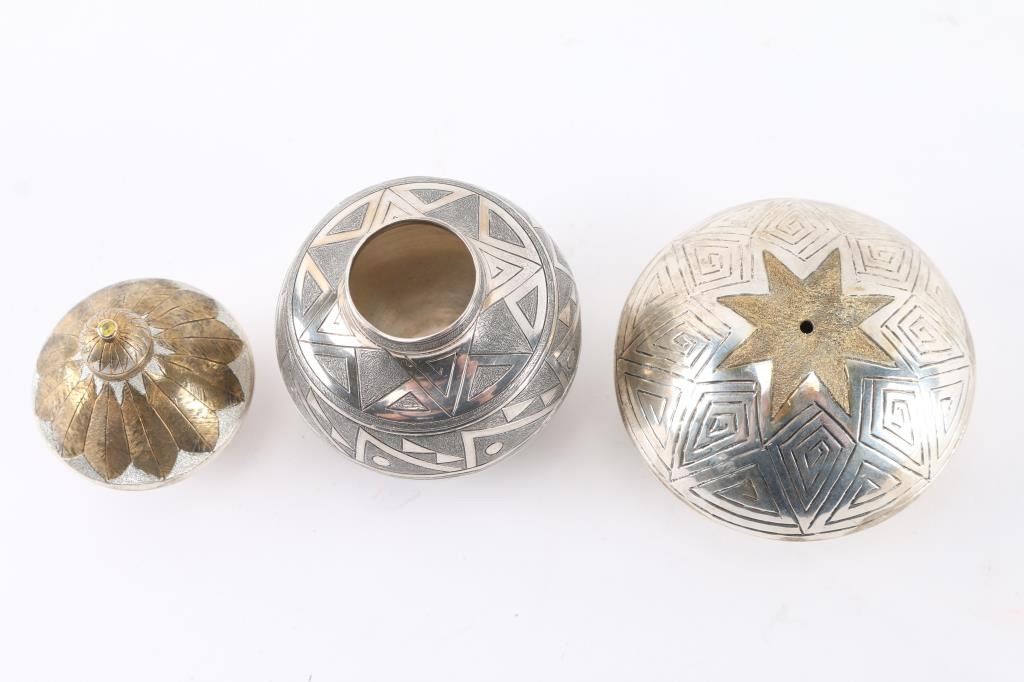 (1) Two-toned pot with lid, sterling and gold, 2" x 1 1/2", maker marked W with arrow.