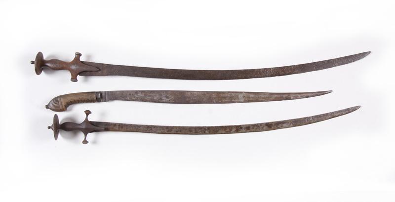 Collection of 3 Swords Consisting of 2 India swords brought from the armory, measures 32" and 35", and a Philippine short sword with carved wooden handle which measures 31" overall.Consisting of 2 India swords brought from the armory, measures 32" and 35", and a Philippine short sword with carved wooden handle which measures 31" overall.