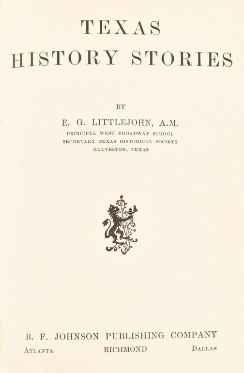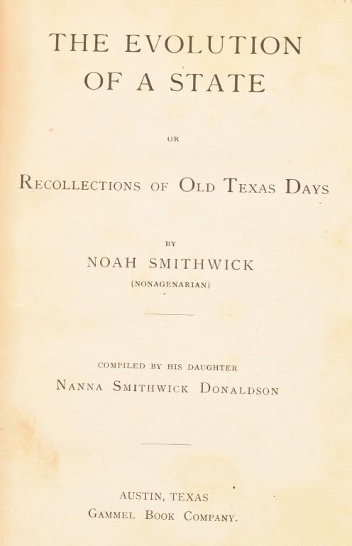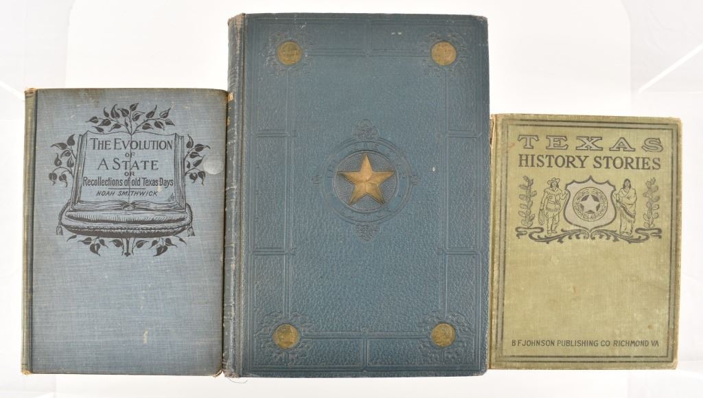 "Texas History Stories" by E.G. Littlejohn 1901 edition. "The Evolution of a State" by Noah Smithwick 1900 first edition. "The Book of Texas" by Holland Thompson.