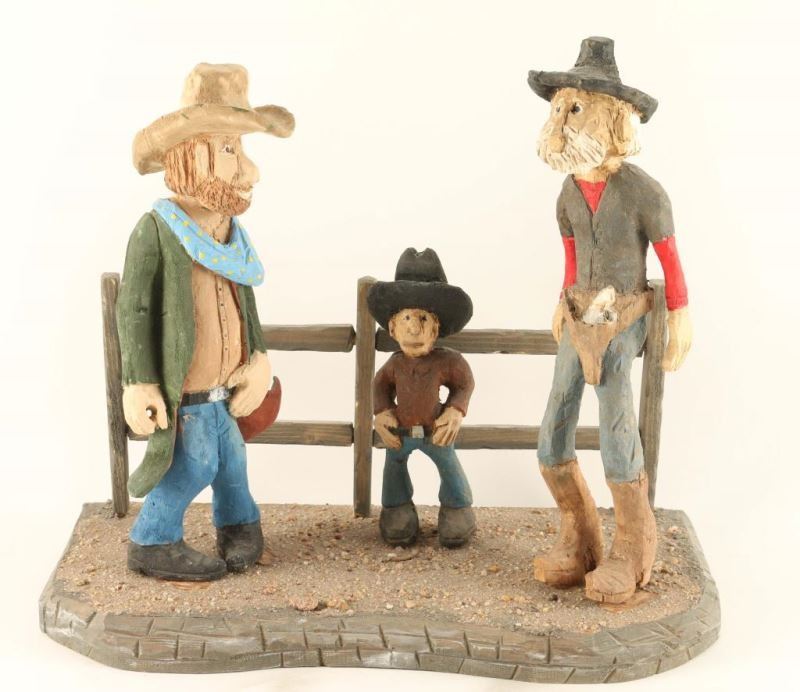 Western Character Caricatures in various sizes, poses and colors with carved base and fence posts. Signed 'B.L. Clarke' on base.