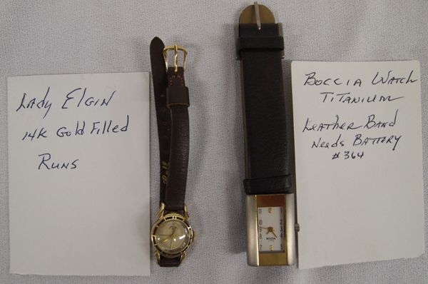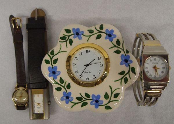 Collection of 3 Watches and 1 Clock, largest is the clock and it measures 3.25''W x 3''H x 1 3/8''Deep, #1 Quartz Clock in handpainted ceramic flower case, back of clock reads ''A friend for all time'' and there is a paper label on the bottom which reads ''Hand Pained in Eden Prairie, Minnesota #2 Chico's Hinged Watch Bracelet #3 Boccia Watch Titanium with leather band, needs battery #364 #4 Lady Elgin 14K Gold Filled Watch, it runs