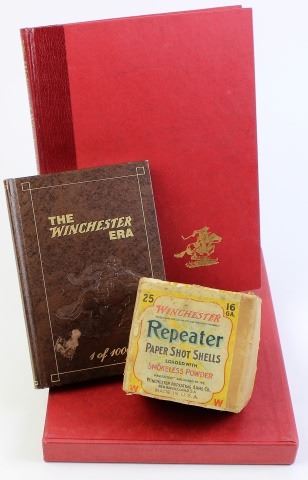 "The History of Winchester " by Watrous with sleeve, "The Winchester Era signed by author George Madis and shotgun shell box.