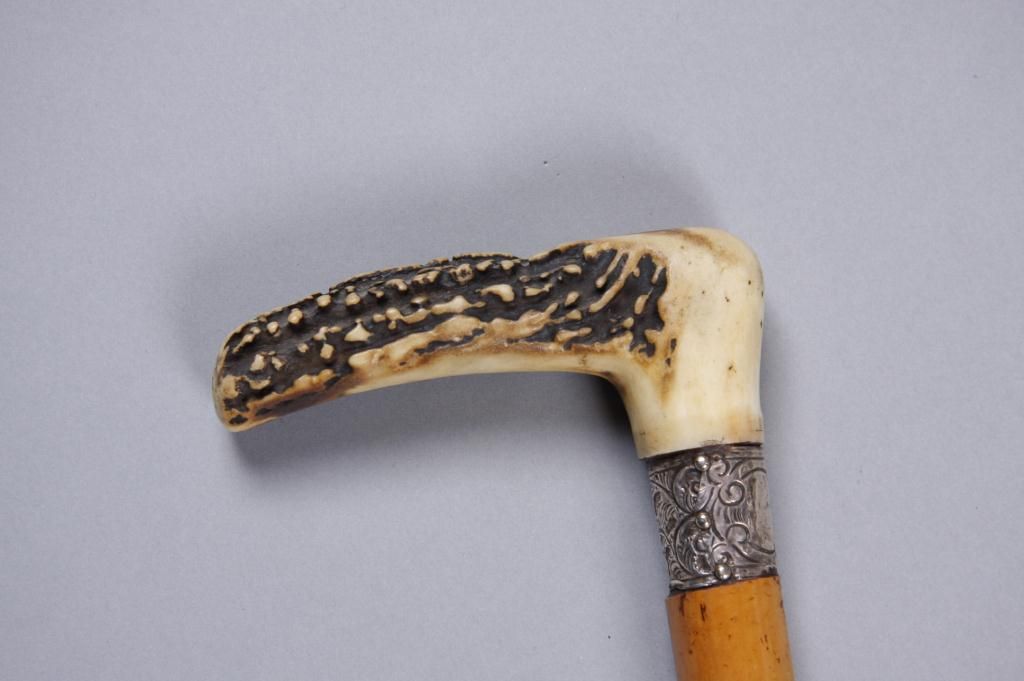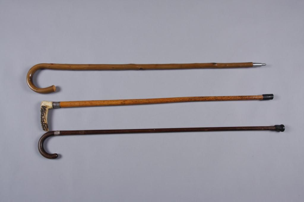 Collection of 3 Wooden CanesIncludes 1 birch with floral folk art design, 1 with a sterling silver band, and 1 with an antler handle and sterling silver band.
