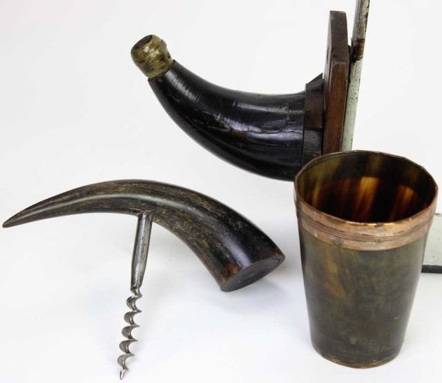 Collection of 3 antique horn itemsincluding copper rimmed drinking cup, horn handled saloon cork screw, and coat or hat hook on board. Est. 250-350