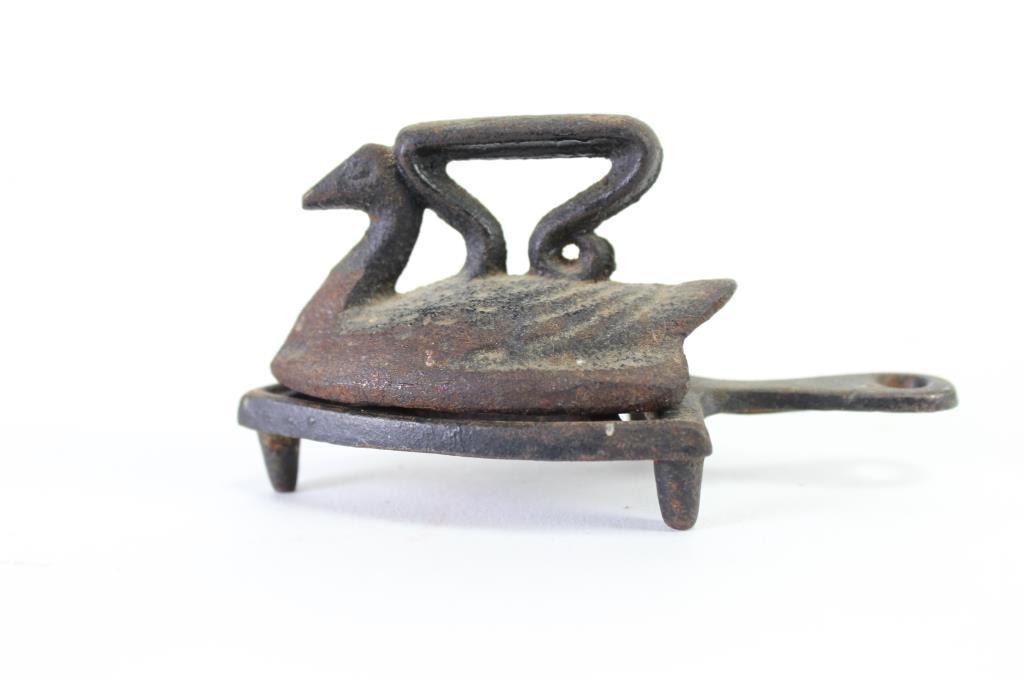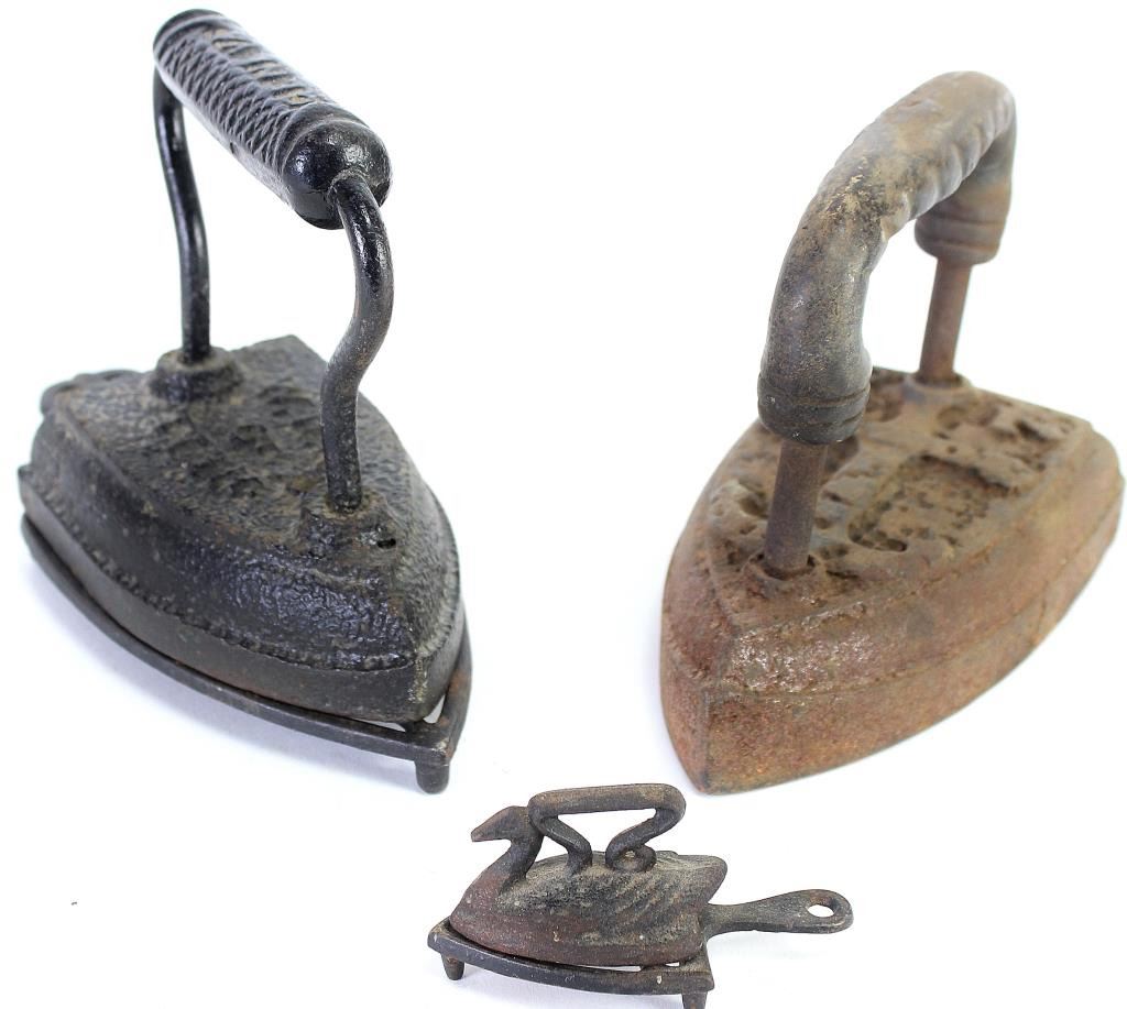 Collection of 3 antique sad irons 2 on trivets includes small childs toy 3" long. 2 on trivets includes small childs toy 3" long.