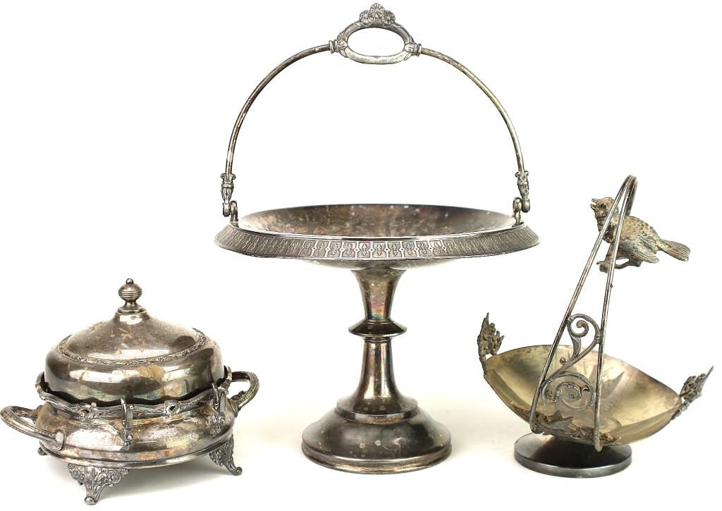 Collection of 3 antique silver plate items includes figural bird, butter dish and compote.