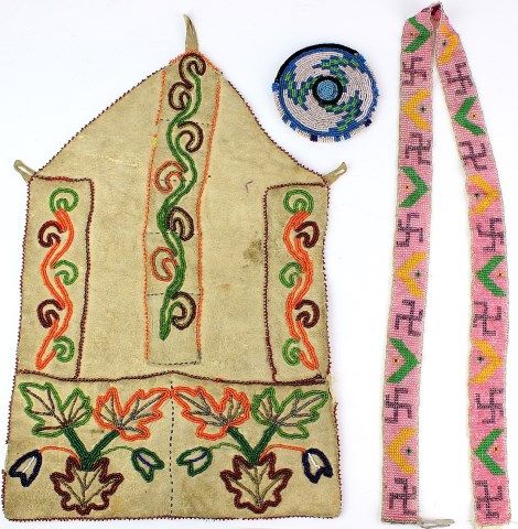 double wall pocket 10" X 15", beaded round pouch and loom beaded strip with rolling log designs. Est. 150-350