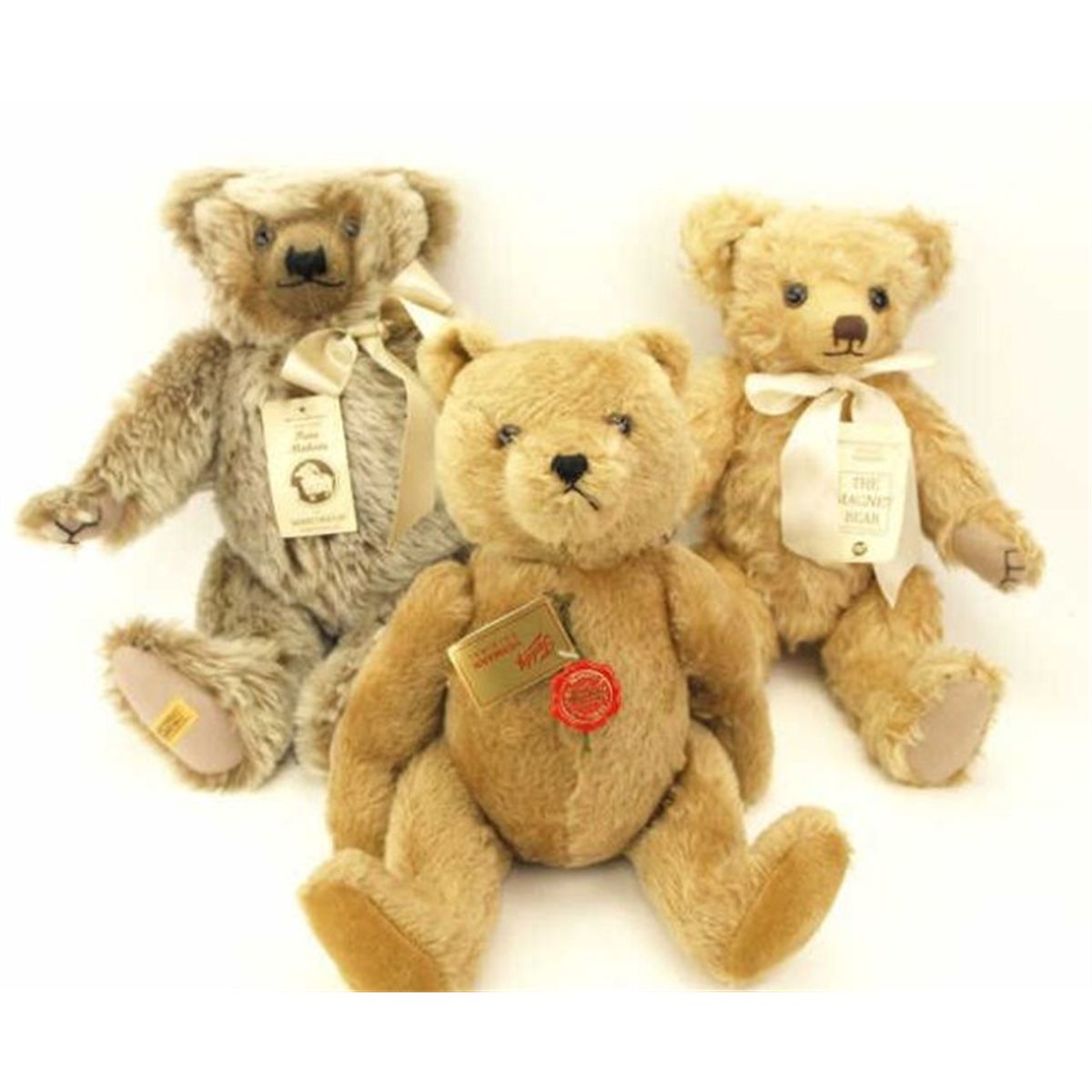 Collection of 3 collectible Teddy Bears 2 by Merrythought based on early designs, original tags intact, 17" and 16" tall. One Herman original 16" tall with original hang tag intact.
