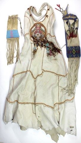 items includes leather dress, beaded and fringed pipe bag 26" long and beaded and fringed draw string bag 16" long. Est. 200-350