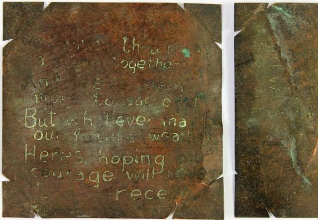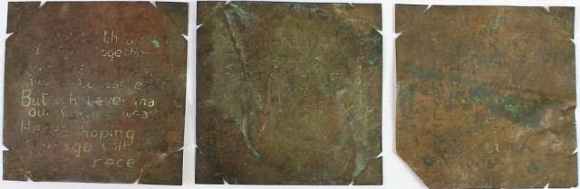 Collection of 3 copper platesfrom an old pioneer wagon, each engraved, 2 with names of individuals, the other reading "We passed thru many a storm together and we've many more to succeed but whatever maybe our future weather heres hoping our couragewill never recede," each 4" X 4". Est. 150-300