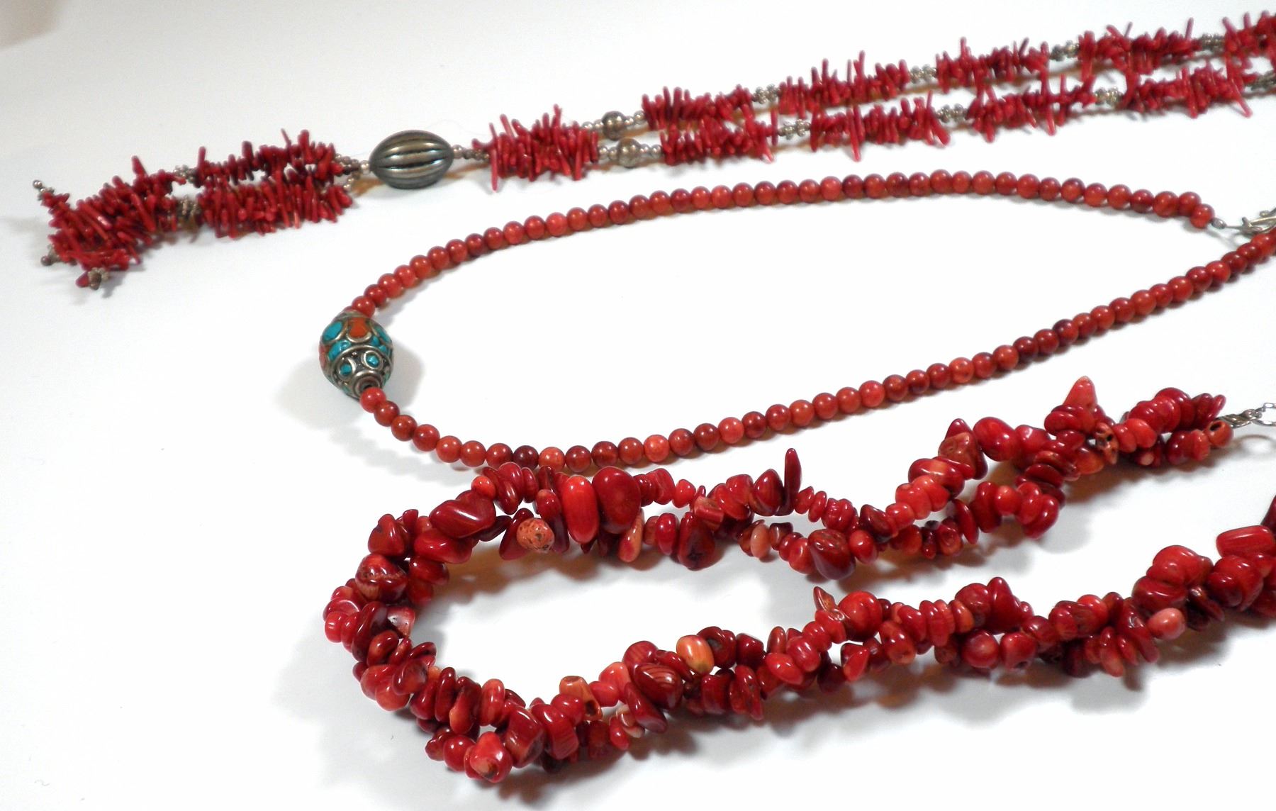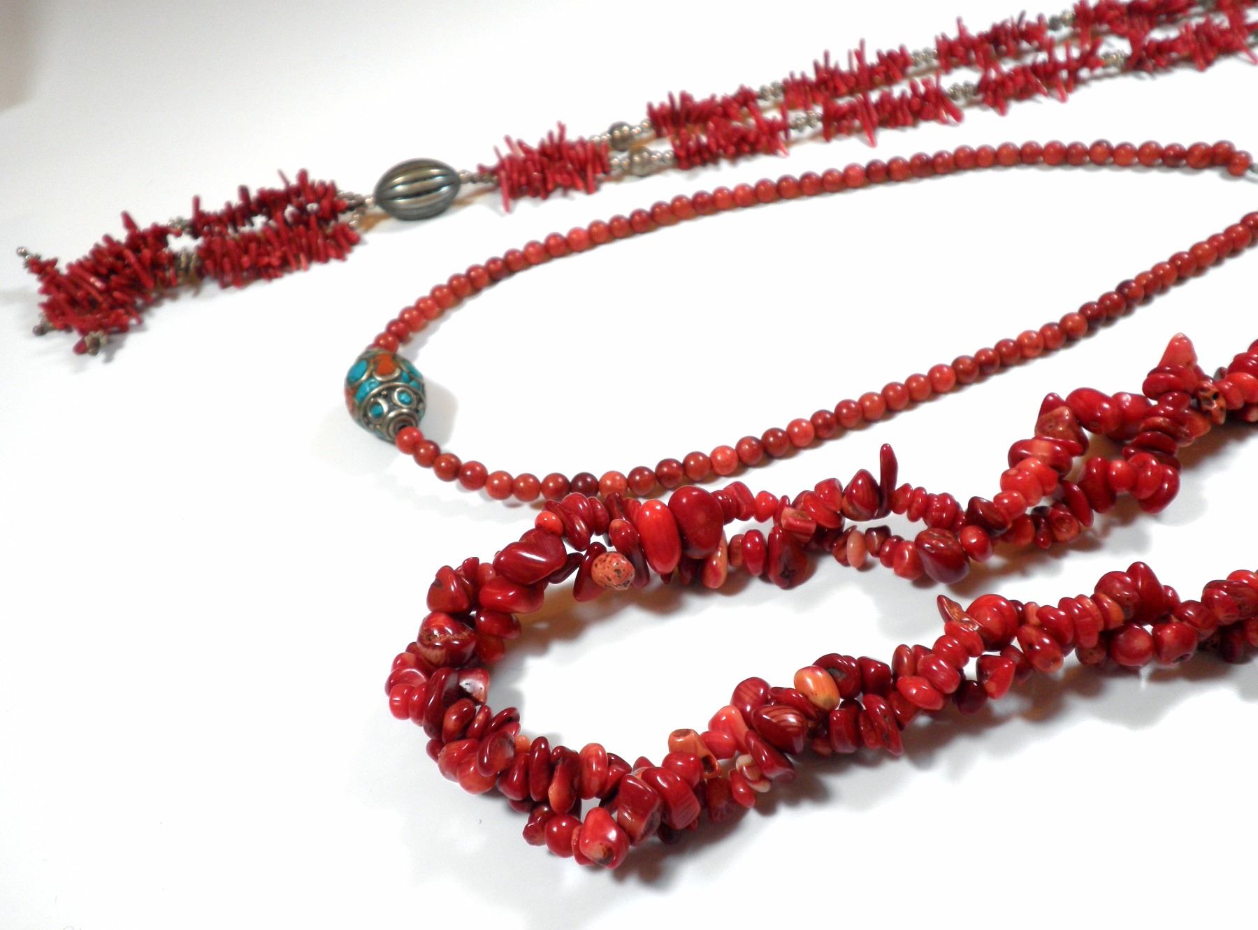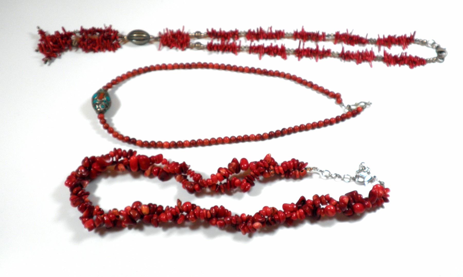 Collection of 3 coral necklaces, corals in two of the necklaces appear to be colored, total weight: 102 gm, length: 42-44 cm.