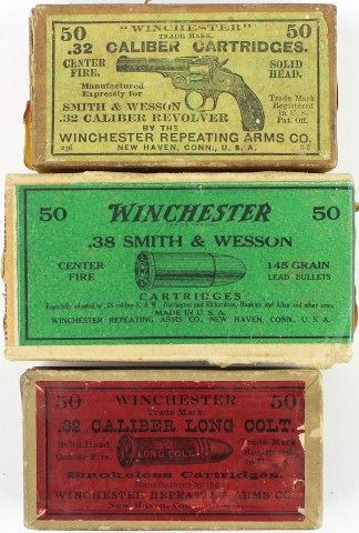 cartridge boxes including Winchester 32 Smith & Wesson, Winchester 38 Smith & Wesson, and Winchester 32 Long Colt. Est 25-75