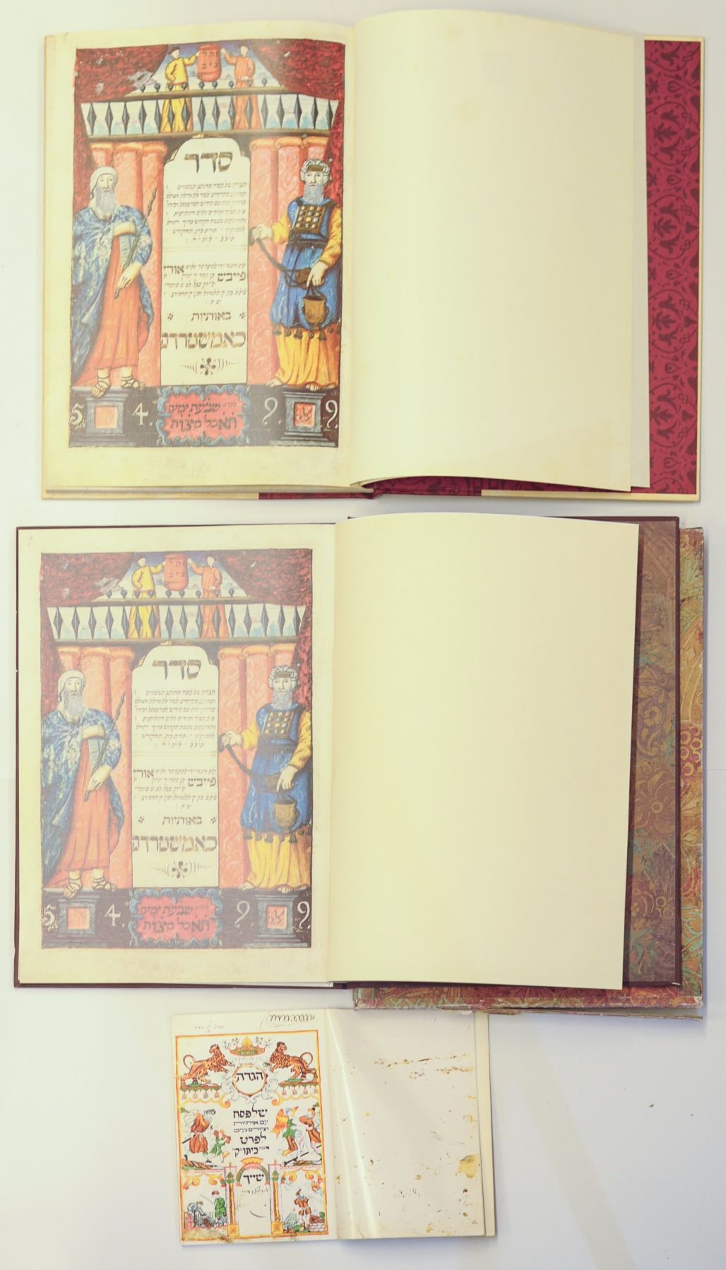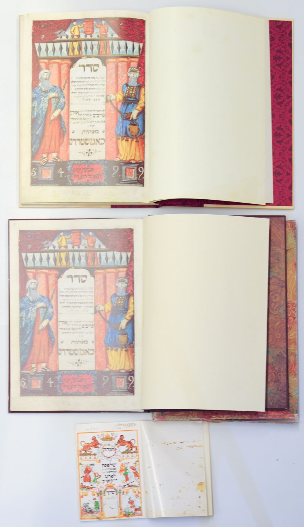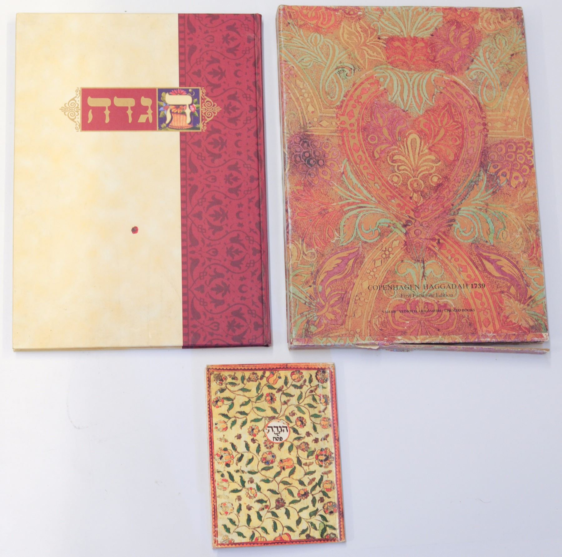 Collection of 3 facsimile Passover Haggadot: 1. Haggadat Ashkenaz, Germany, 1768, miniature edition, El Al gift, without cardboard binding, 2. 2 Copenhagen Haggadot, 1739, one has flaw in bottom part of cardboard binding and the other was given to employees of the Ministry of Justice (missing cardboard cover).