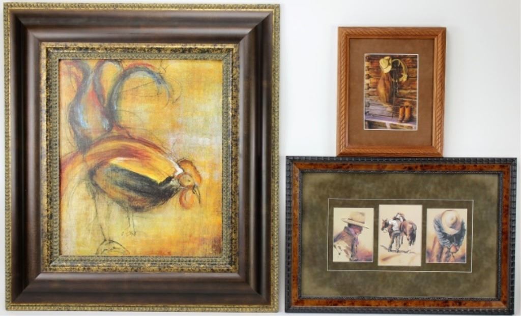 Collection of 3 framed items includes 2 cowboy prints and print on board abstract of a rooster, largest 14" X 17". Est. 50-100