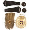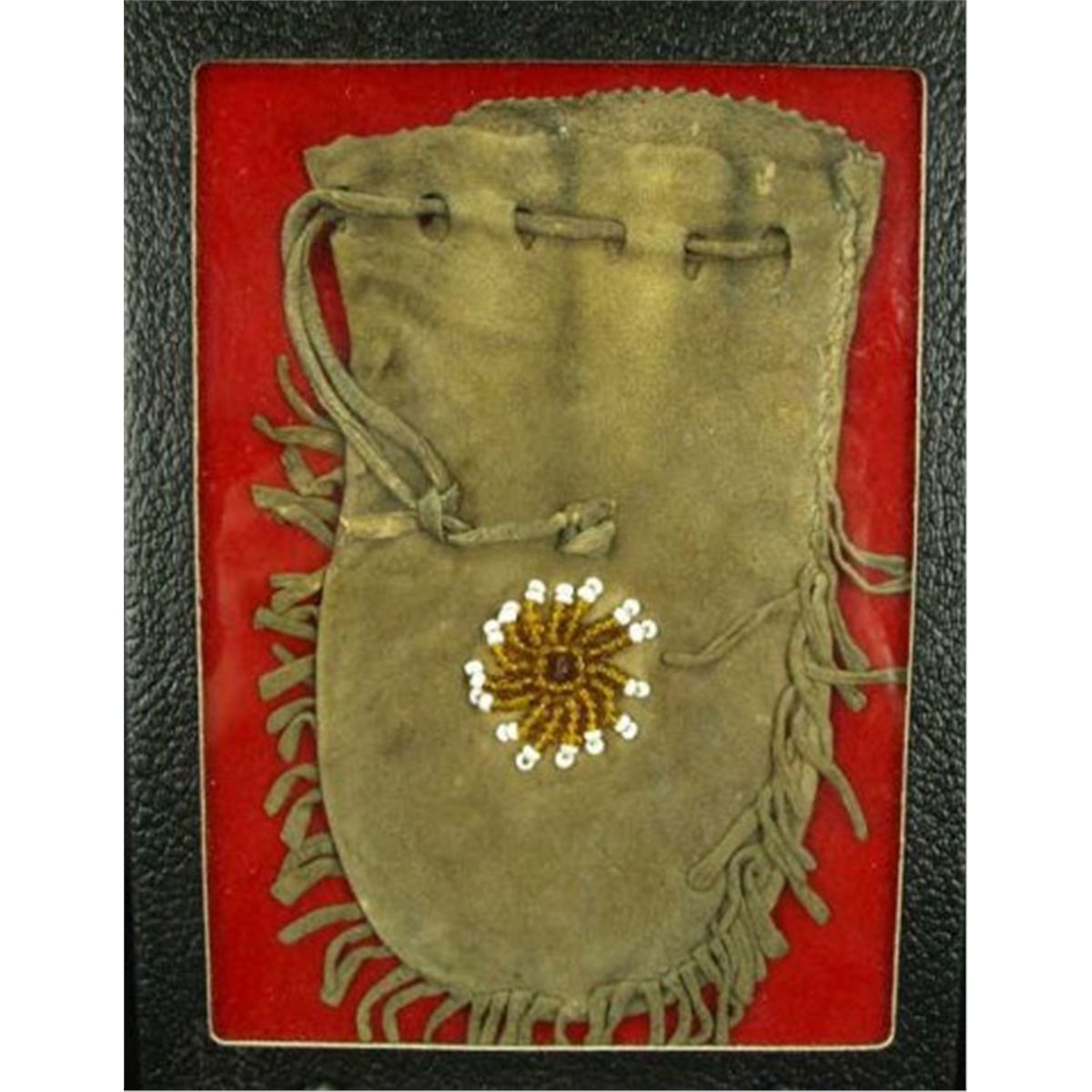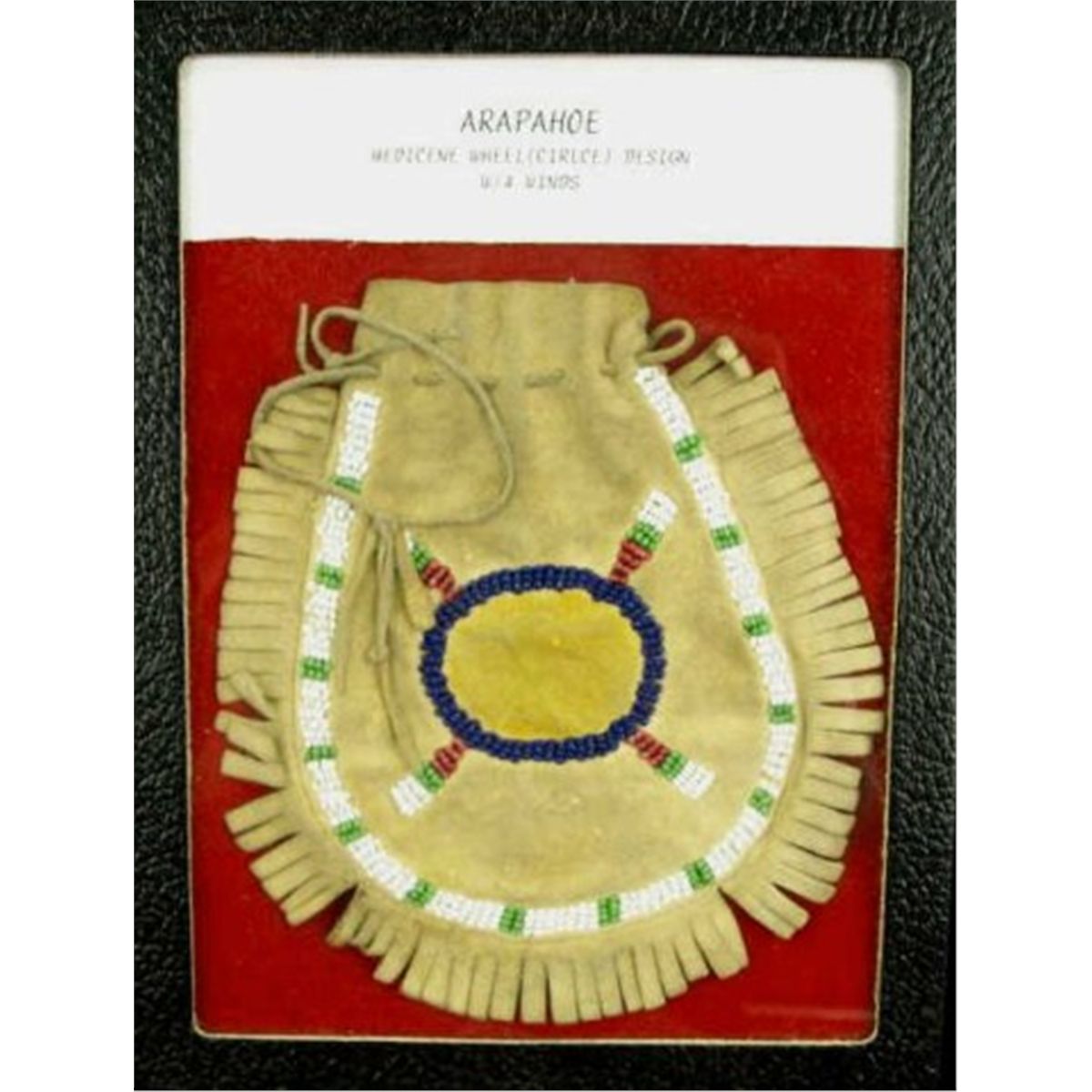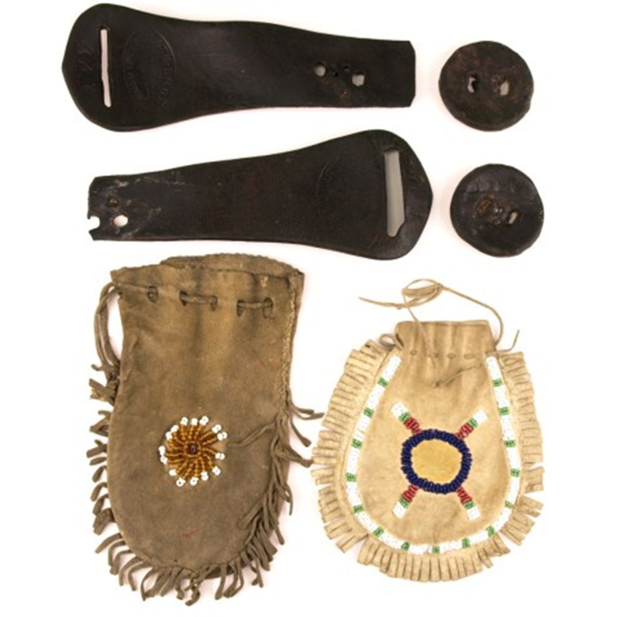 Collection of 3 includes 2 bags and saddle parts The first bag C. 1900 Arapahoe with medicine wheel design. The second C.1900 beaded Plains Poke bag. And a collection of 4 Sentinel Butte saddle tabs and rosettes.