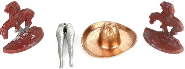 vintage bookends, lady leg nut cracker and vintage copper cowboy hat ashtray. Est. 25-75